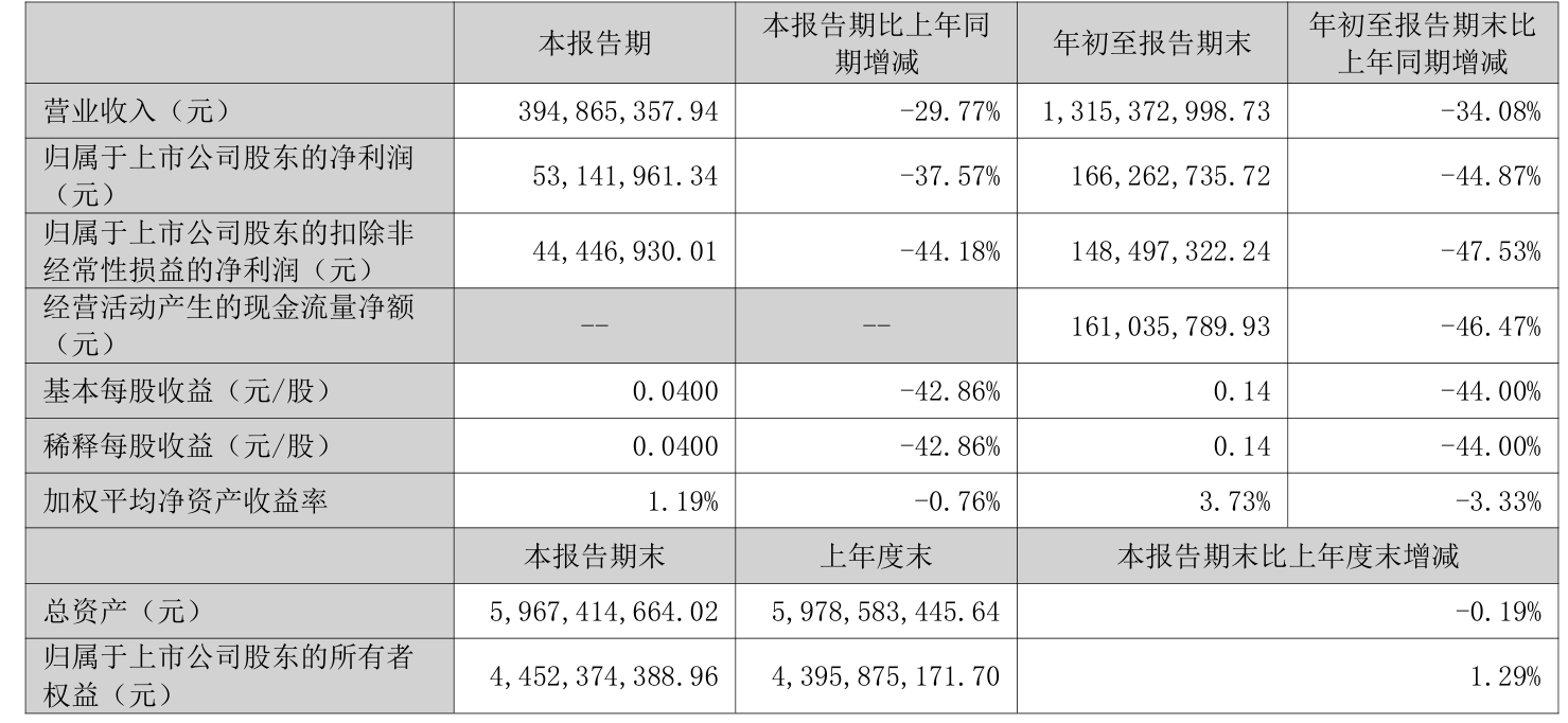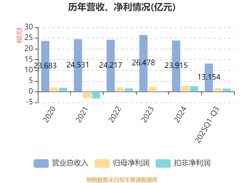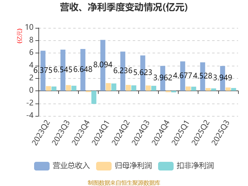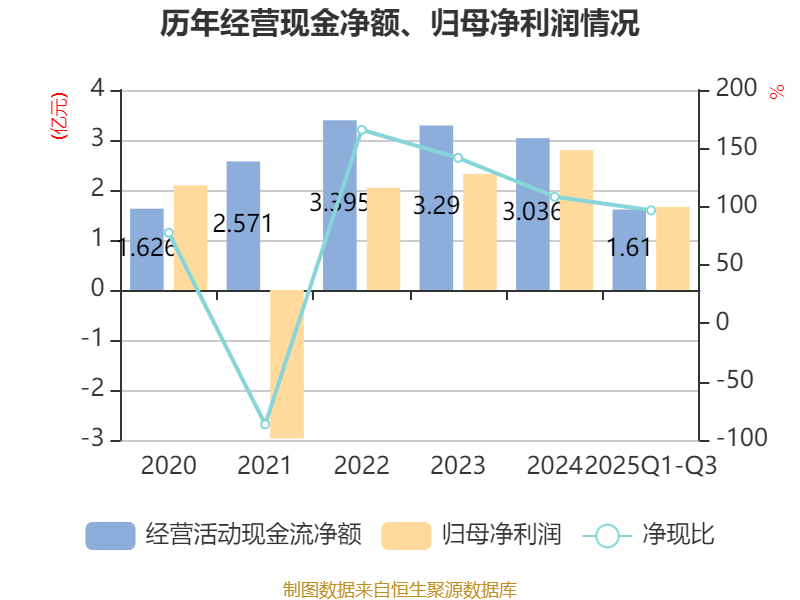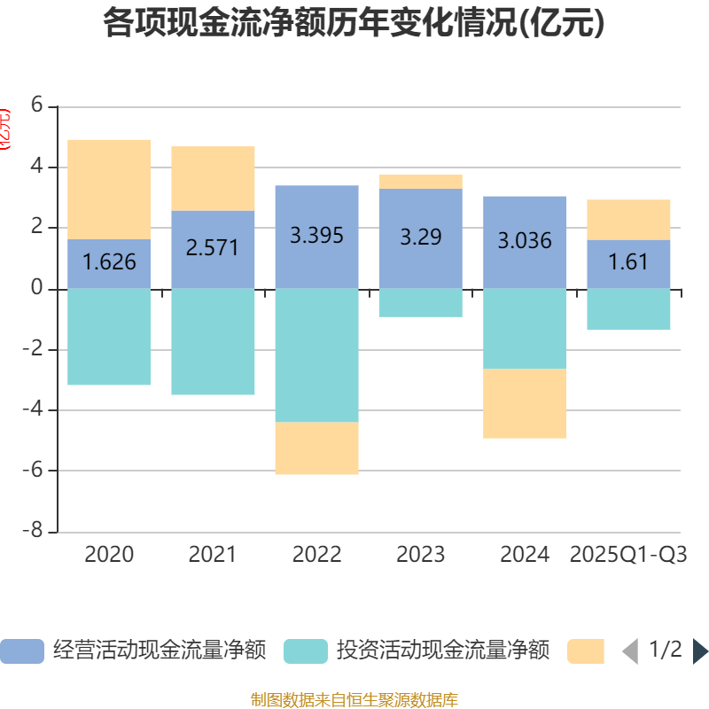 2025年前三季度,公司经营活动现金流净额为1.61亿元,同比下降46.47%;筹资活动现金流净额1.32亿元,同比增加3.45亿元;投资活动现金流净额-1.35亿元,上年同期为-1.9亿元。