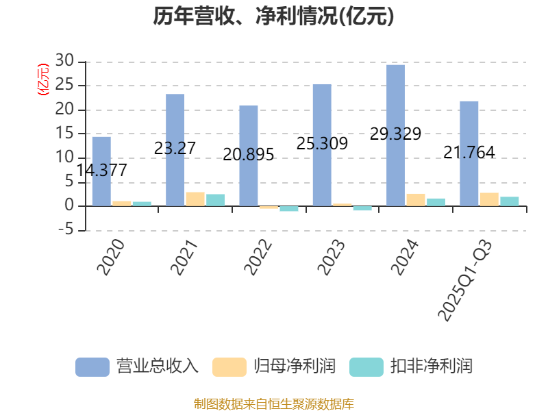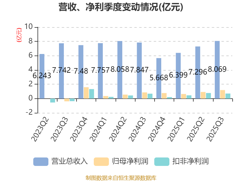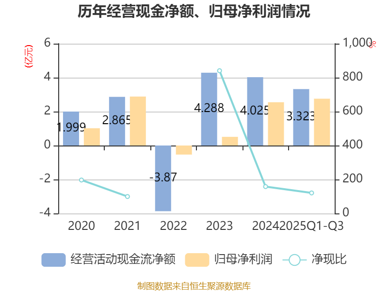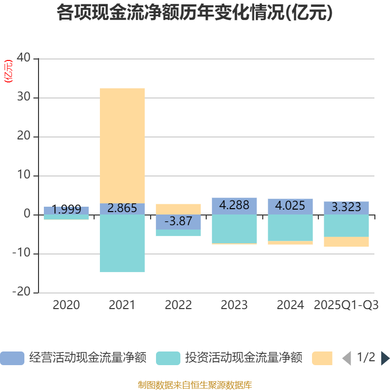 2025年前三季度,公司经营活动现金流净额为3.32亿元,同比增长14.24%;筹资活动现金流净额-2.51亿元,同比减少1.54亿元;投资活动现金流净额-5.74亿元,上年同期为-6.57亿元。