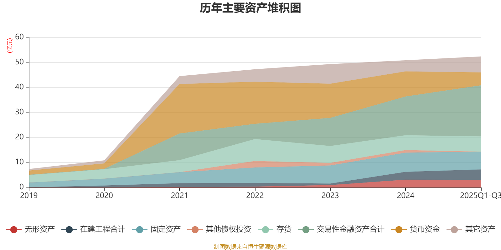 资产重大变化方面,截至2025年三季度末,公司货币资金较上年末减少48.86%,占公司总资产比重下降9.93个百分点;交易性金融资产合计较上年末增加31.8%,占公司总资产比重上升8.52个百分点;其他债权投资较上年末减少100%,占公司总资产比重下降2.07个百分点;一年内到期的非流动资产占公司总资产的2.06%,上年末为0。