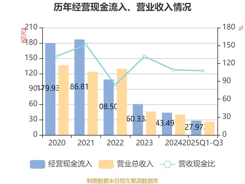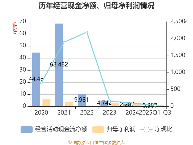 2025年前三季度,公司经营活动现金流净额为3866.85万元,同比下降37%;筹资活动现金流净额-1.81亿元,同比增加17.75亿元;投资活动现金流净额-2975.71万元,上年同期为30.34亿元。