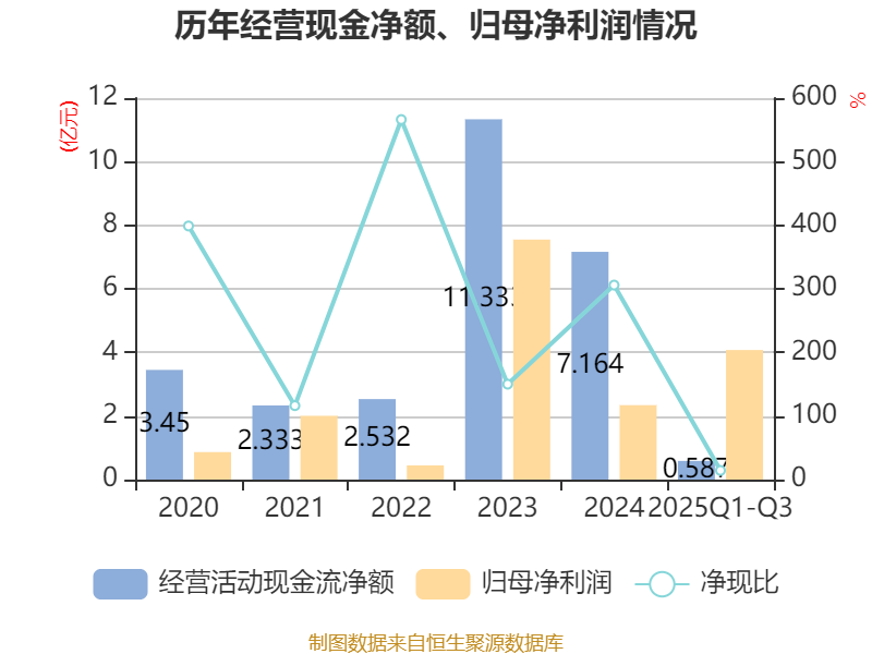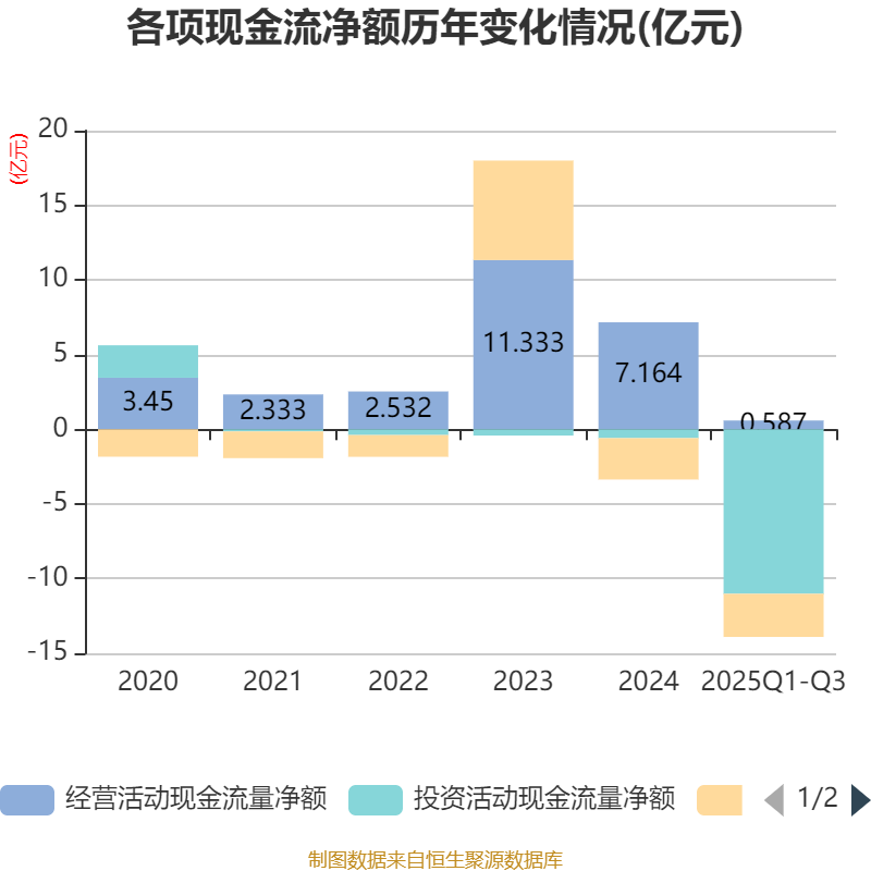 2025年前三季度,公司经营活动现金流净额为5865.43万元,同比下降79.86%;筹资活动现金流净额-2.89亿元,同比减少1.89亿元;投资活动现金流净额-11.02亿元,上年同期为-6.38亿元。