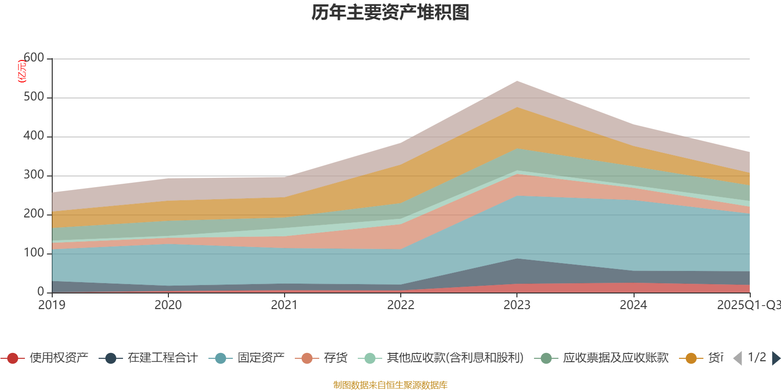 资产重大变化方面,截至2025年三季度末,公司货币资金较上年末减少38.22%,占公司总资产比重下降3.14个百分点;其他应收款(含利息和股利)较上年末增加130.93%,占公司总资产比重上升2.62个百分点;在建工程合计较上年末增加13.71%,占公司总资产比重上升2.57个百分点;存货较上年末减少42.79%,占公司总资产比重下降2.29个百分点。