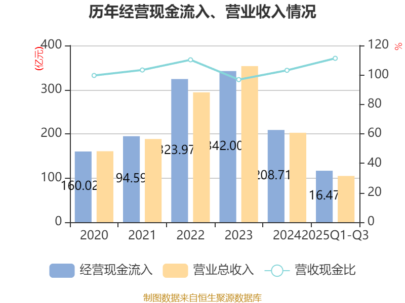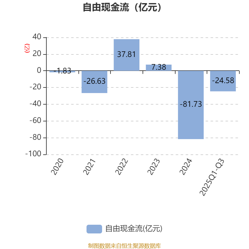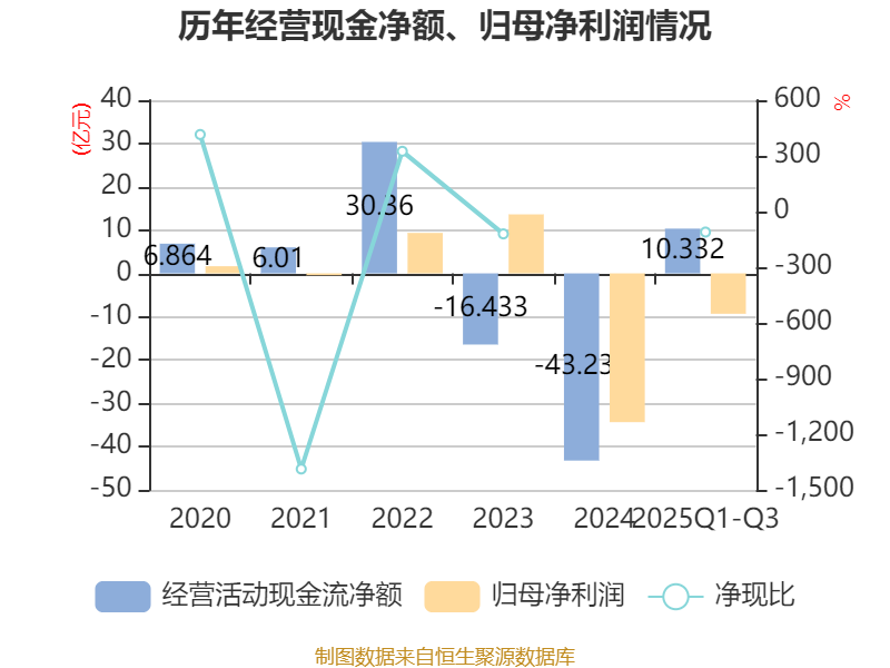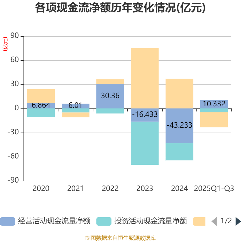 2025年前三季度,公司经营活动现金流净额为10.33亿元,同比增加54.29亿元;筹资活动现金流净额-18.54亿元,同比减少62.26亿元;投资活动现金流净额-4.88亿元,上年同期为-18.4亿元。