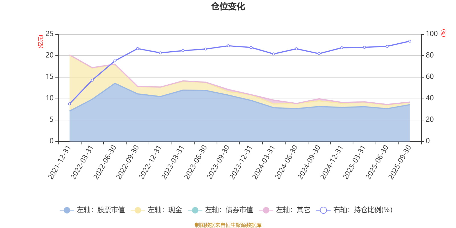 据定期报告数据统计,近三年平均股票仓位为86.47%,同类平均为85.88%。2025年三季度末基金达到93.52%的最高仓位,2021年末最低,为35.1%。