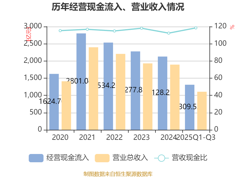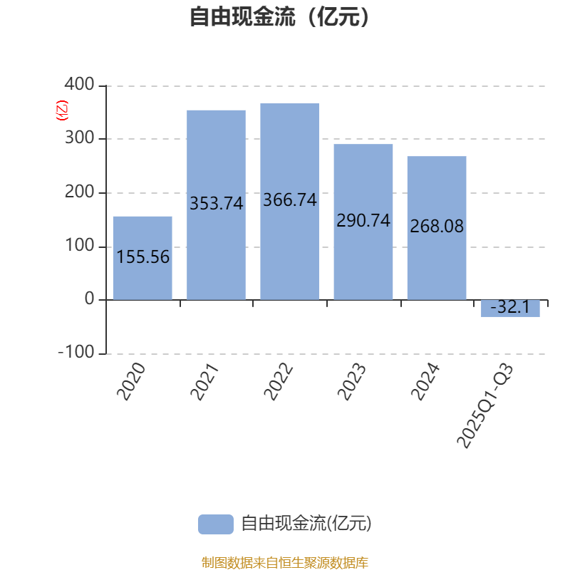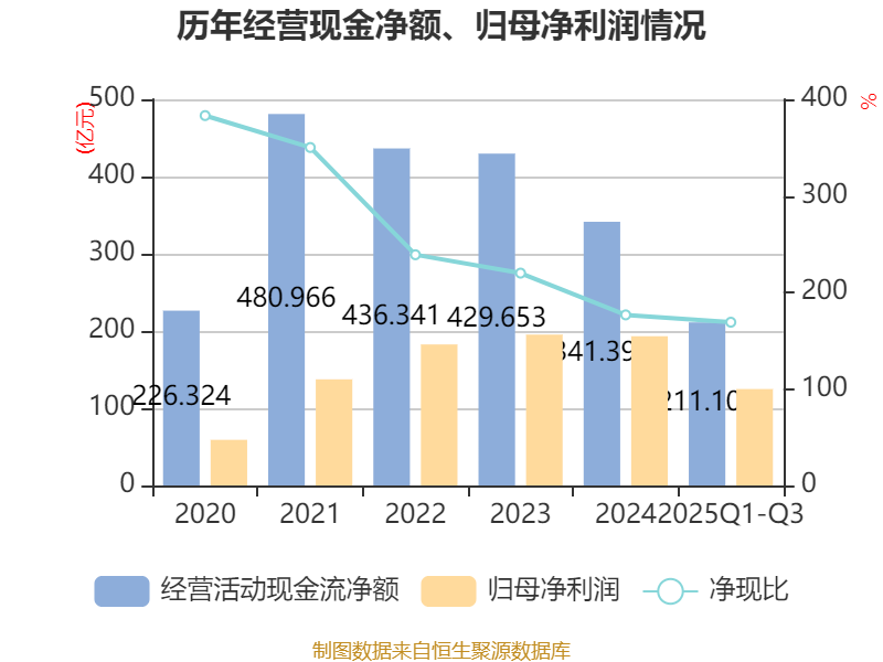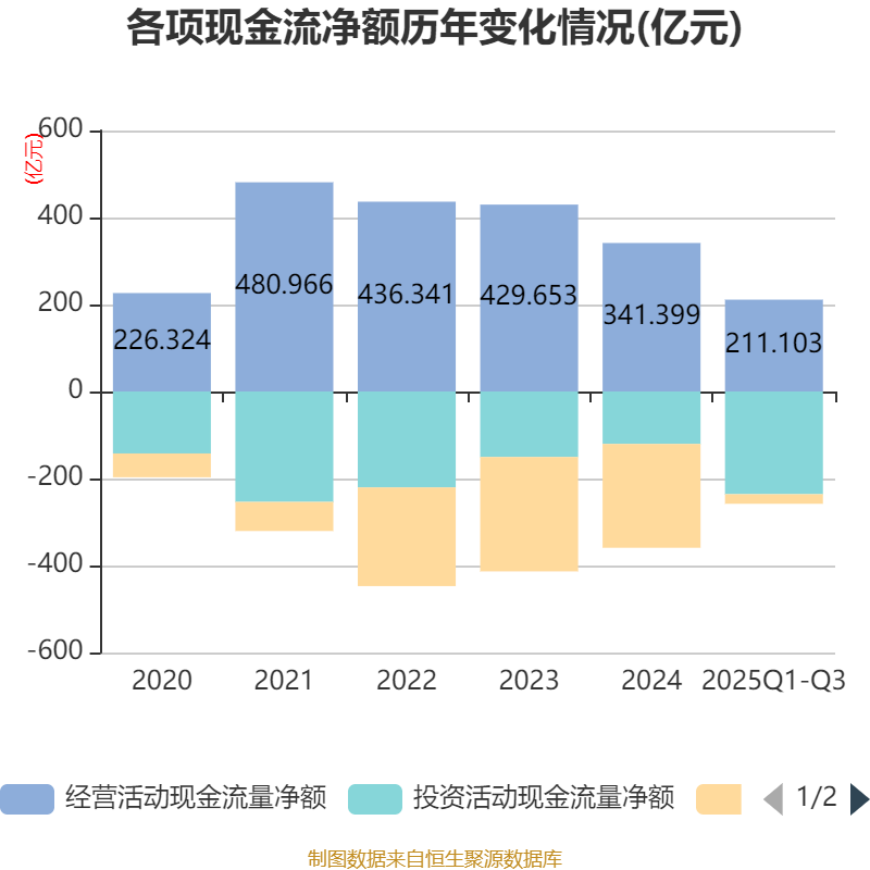 2025年前三季度,公司经营活动现金流净额为211.1亿元,同比下降18.04%;筹资活动现金流净额-22.02亿元,同比增加162.64亿元;投资活动现金流净额-236.08亿元,上年同期为-38.44亿元。
