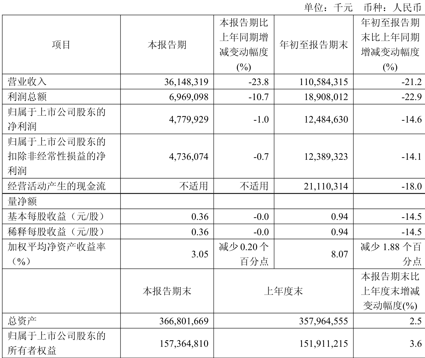 中证智能财讯中煤能源(601898)10月28日披露2025年第三季度报告。前三季度公司实现营业总收入1105.84亿元,同比下降21.24%;归母净利润124.85亿元,同比下降14.57%;扣非净利润123.89亿元,同比下降14.11%;经营活动产生的现金流量净额为211.1亿元,同比下降18.04%;报告期内,中煤能源基本每股收益为0.94元,加权平均净资产收益率为8.07%。