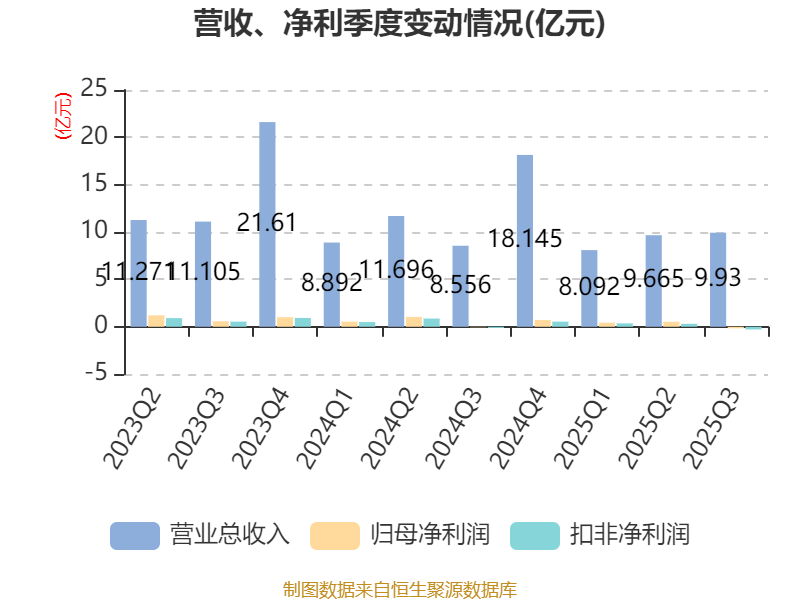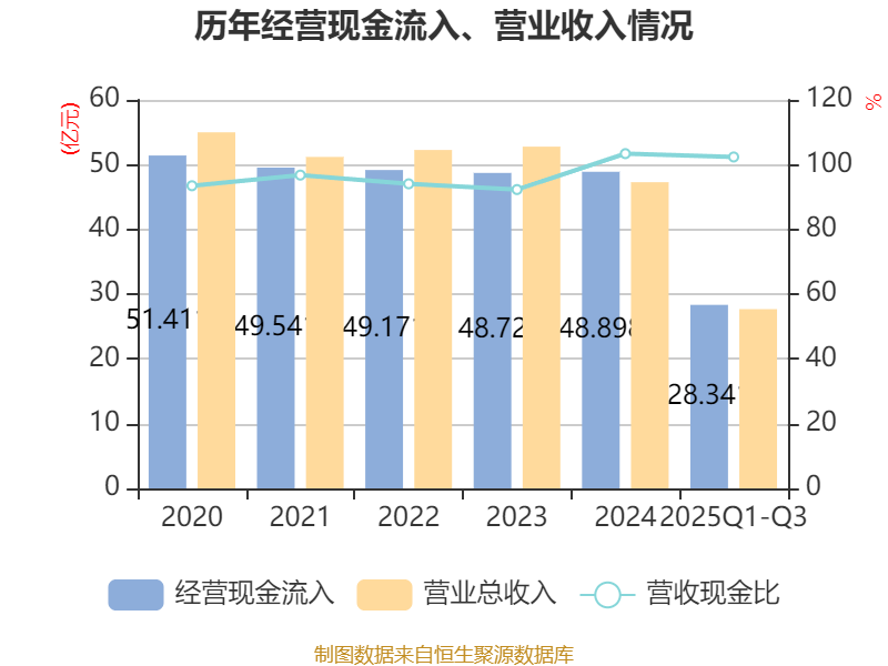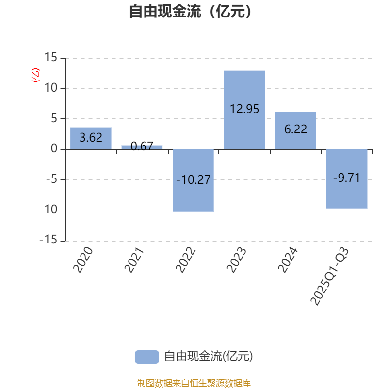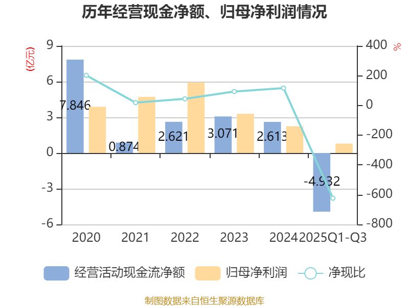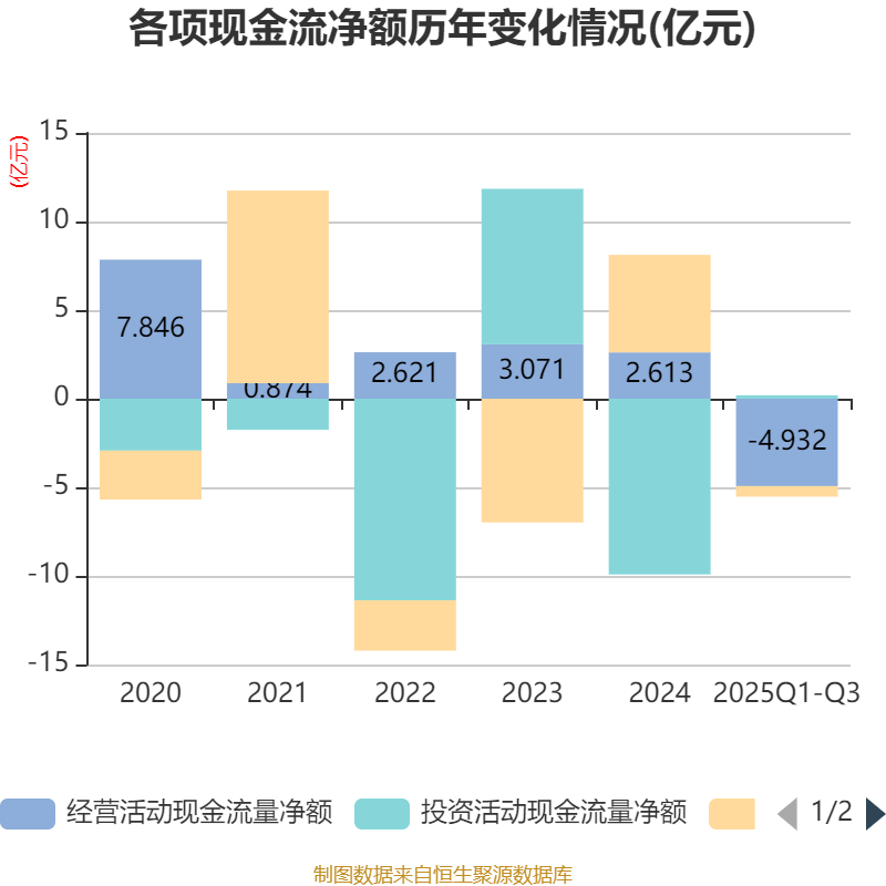 2025年前三季度,公司经营活动现金流净额为-4.93亿元,同比增加2.54亿元;筹资活动现金流净额-5968.85万元,同比减少7.21亿元;投资活动现金流净额1916.28万元,上年同期为-8.28亿元。