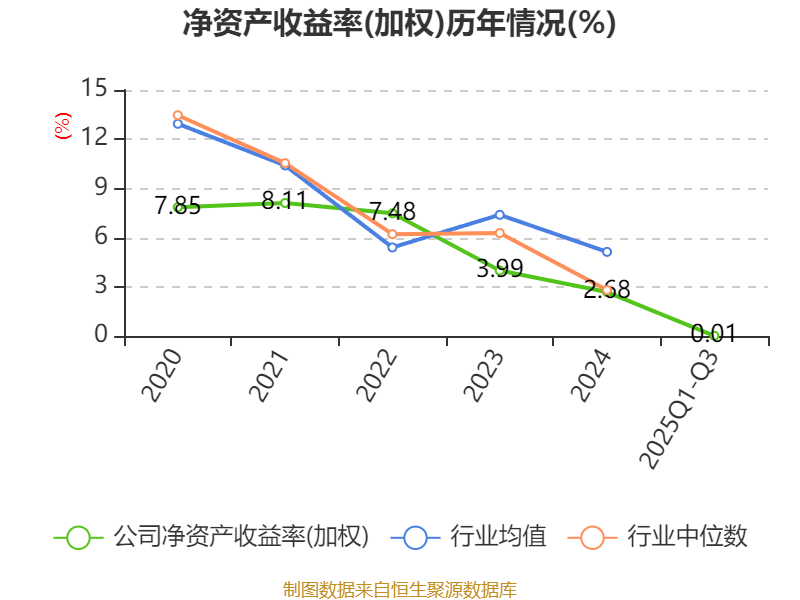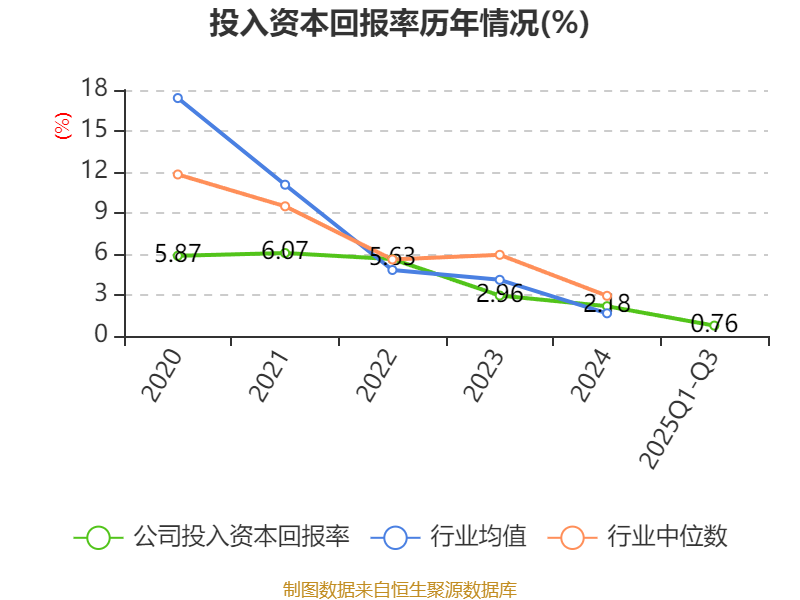 盈利能力方面, 2025年前三季度公司加权平均净资产收益率为0.01%,同比下降1.82个百分点。公司2025年前三季度投入资本回报率为0.76%,较上年同期下降0.69个百分点。