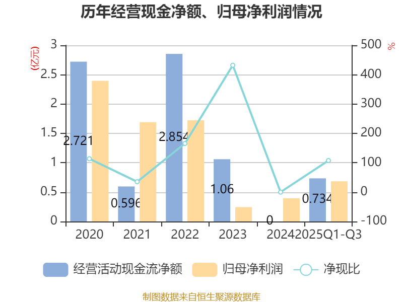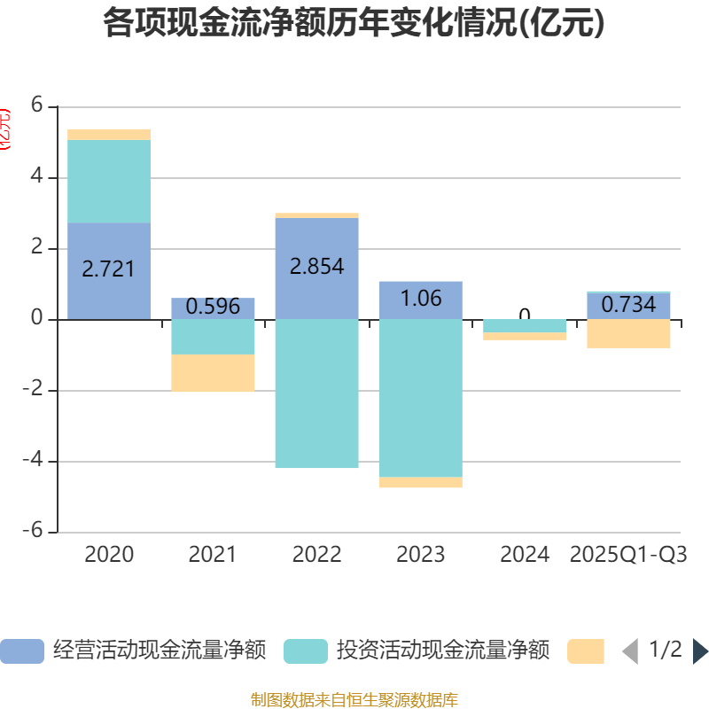 2025年前三季度,公司经营活动现金流净额为7342.9万元,同比增加9615.14万元;筹资活动现金流净额-8224.24万元,同比减少9674.29万元;投资活动现金流净额436.87万元,上年同期为-1.42亿元。
