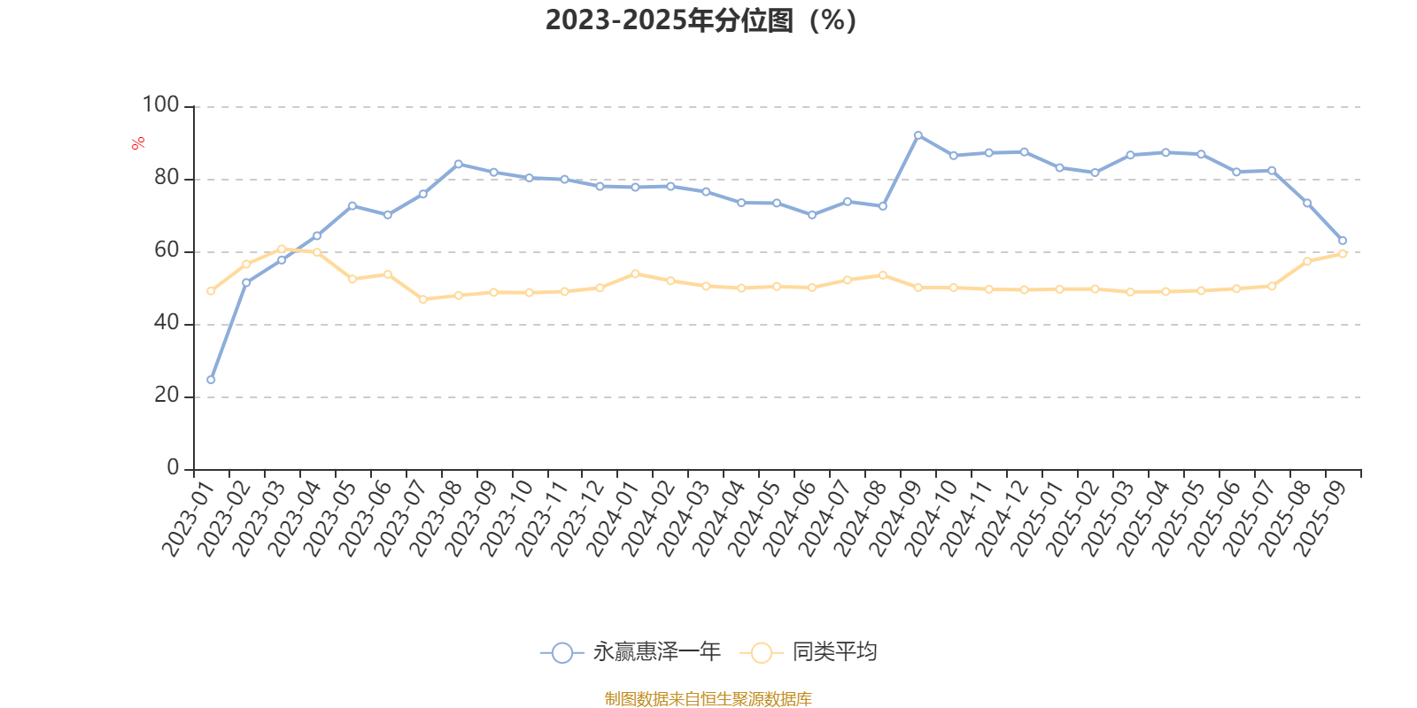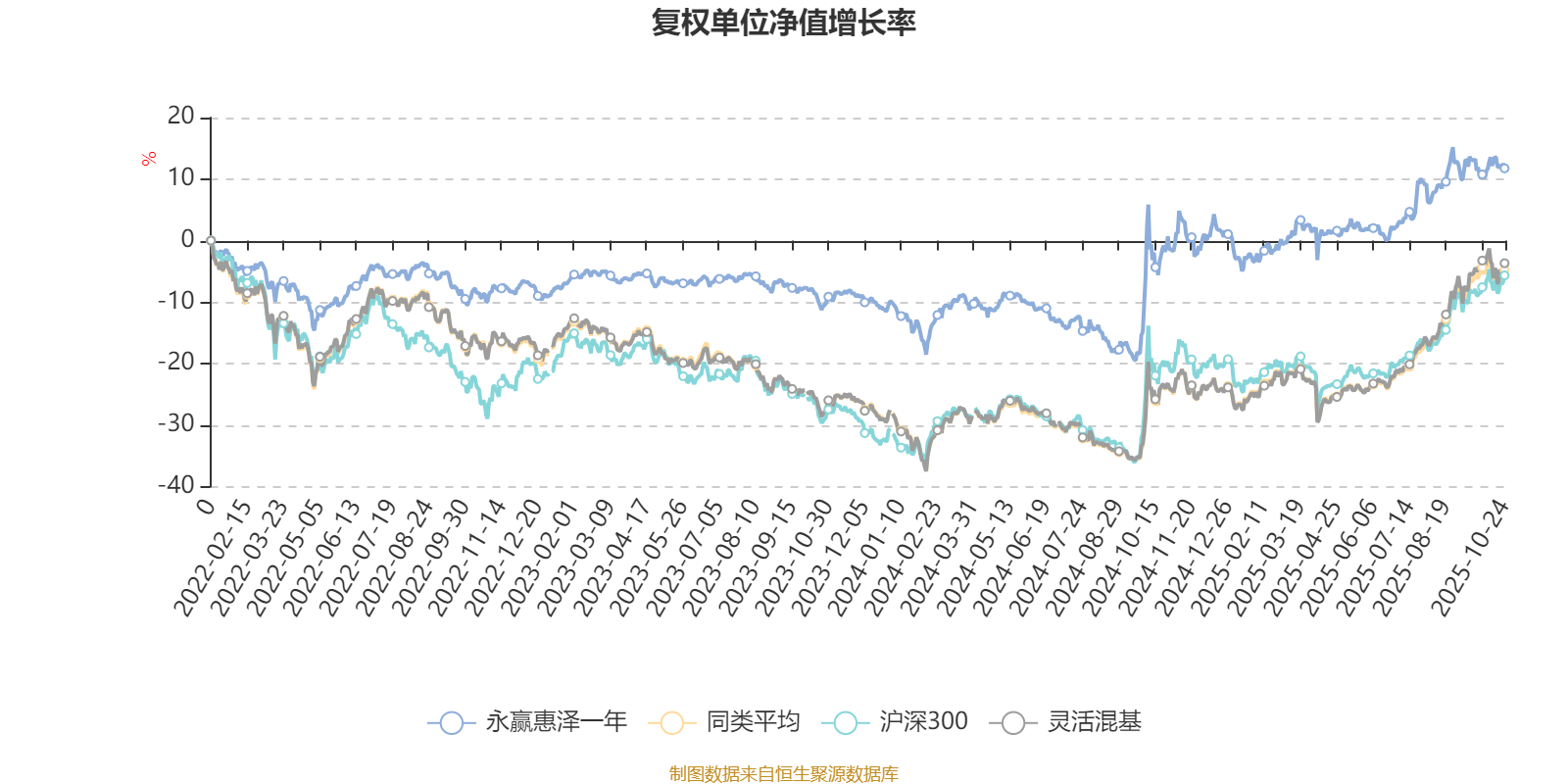 截至10月24日,永赢惠泽一年近三个月复权单位净值增长率为1.48%,位于同类可比基金1114/1287;近半年复权单位净值增长率为10.13%,位于同类可比基金1011/1287;近一年复权单位净值增长率为13.83%,位于同类可比基金845/1287;近三年复权单位净值增长率为23.10%,位于同类可比基金439/1286。
