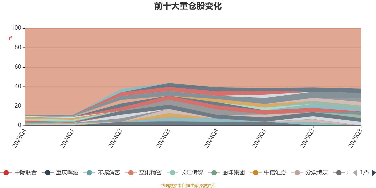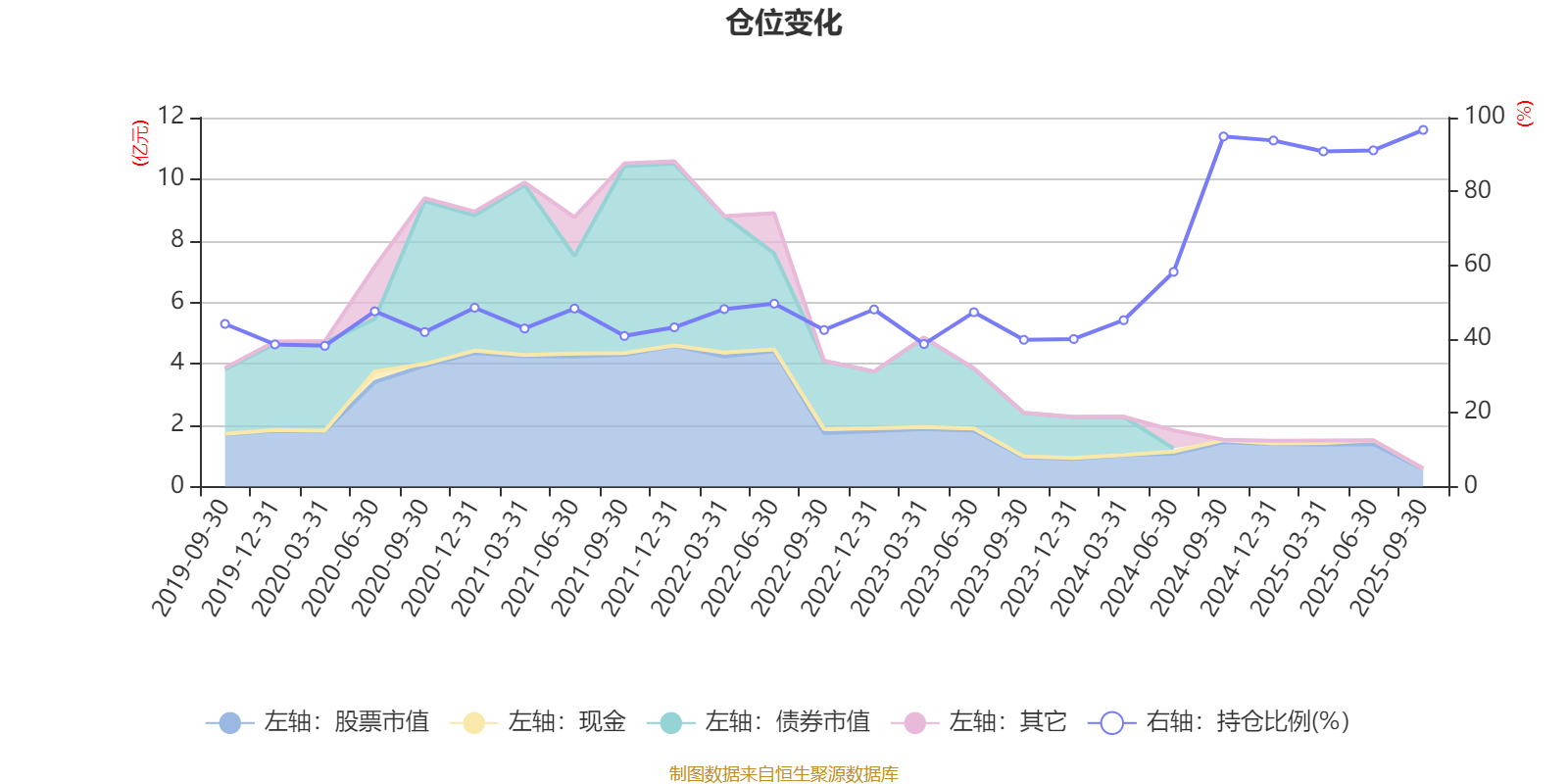 据定期报告数据统计,近三年平均股票仓位为65.35%,同类平均为72.16%。2025年三季度末基金达到96.66%的最高仓位,2020年一季度末最低,为38.15%。