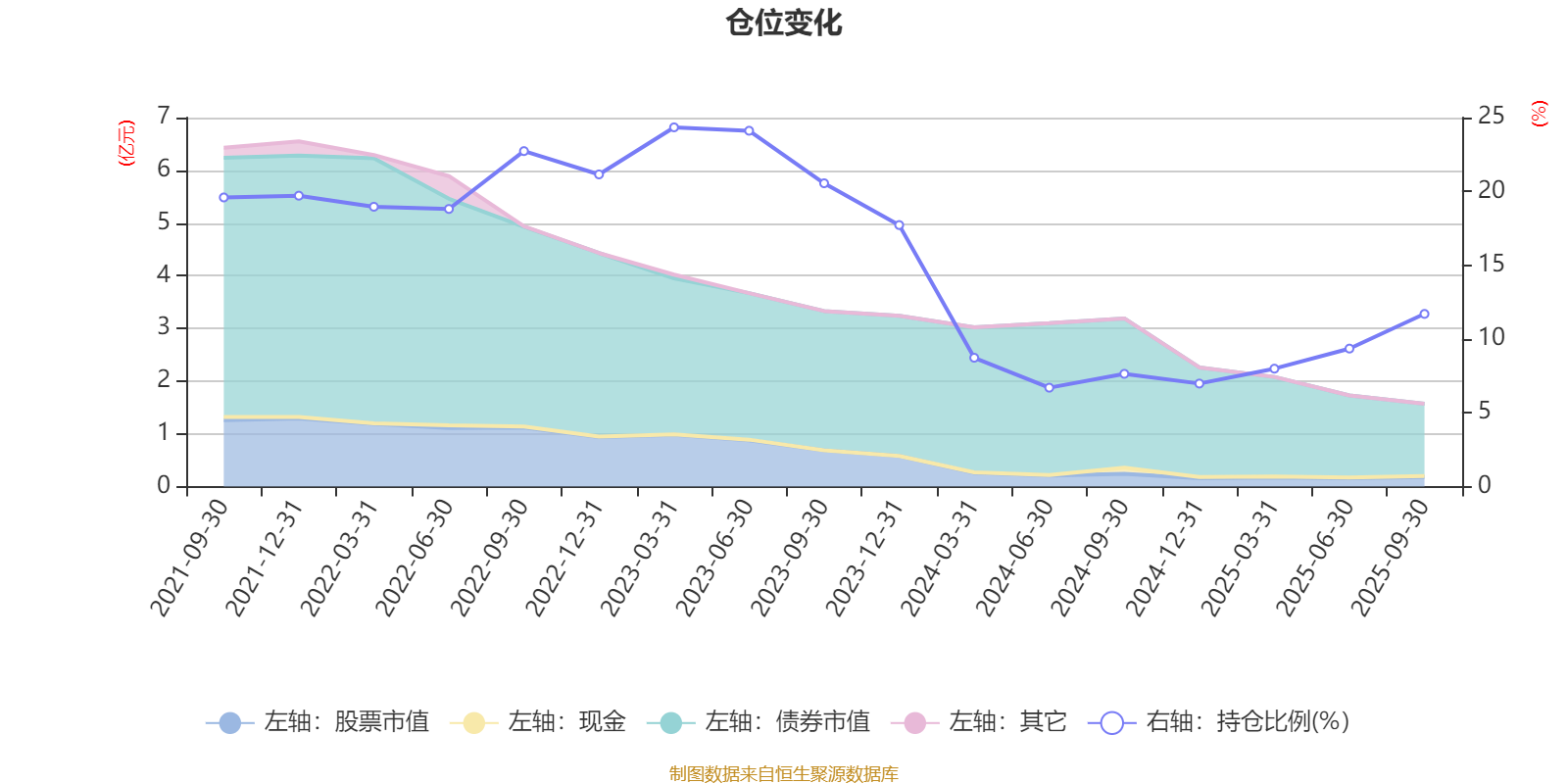据定期报告数据统计,近三年平均股票仓位为13.91%,同类平均为19.03%。2023年一季度末基金达到24.34%的最高仓位,2024年上半年末最低,为6.7%。