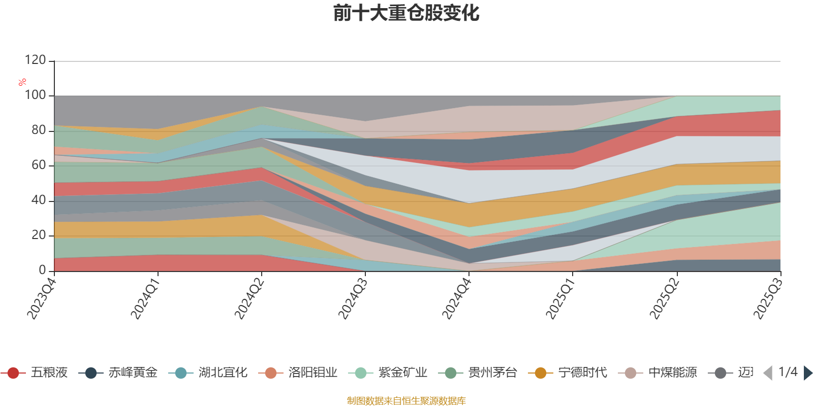该基金持股集中度较高,近2年前十大重仓股集中度长期超过60%。截至2025年三季度末,基金重仓股分别是紫金矿业、金诚信、巨化股份、龙佰集团、洛阳钼业、华通线缆、工商银行、赤峰黄金、天山铝业。
