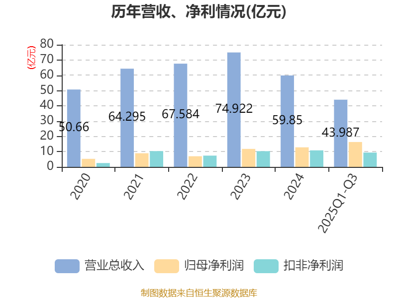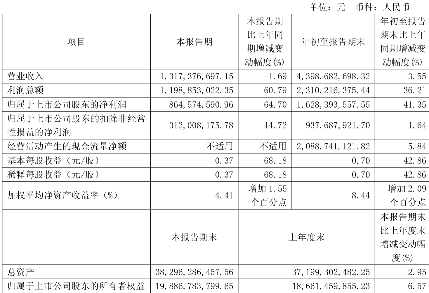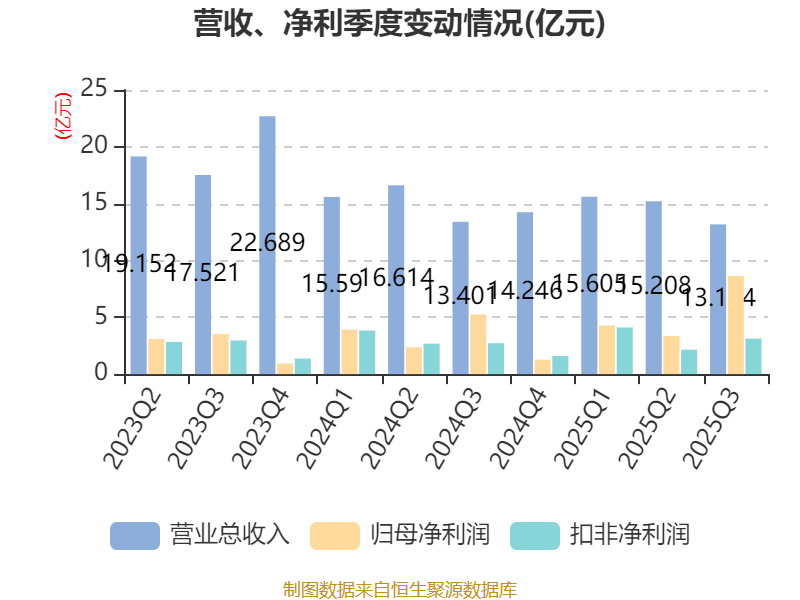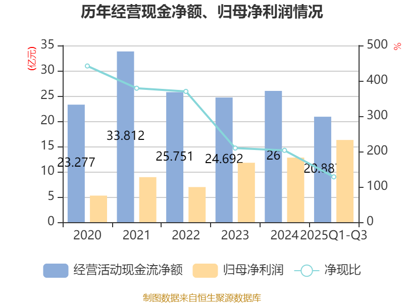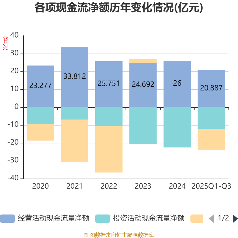 2025年前三季度,公司经营活动现金流净额为20.89亿元,同比增长5.84%;筹资活动现金流净额-11.76亿元,同比减少7.72亿元;投资活动现金流净额-12.19亿元,上年同期为-11.85亿元。