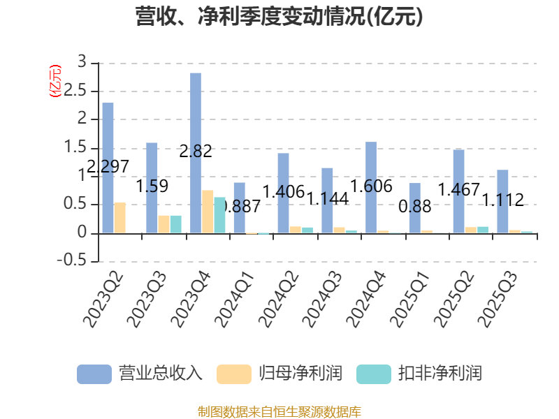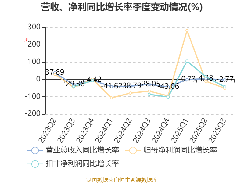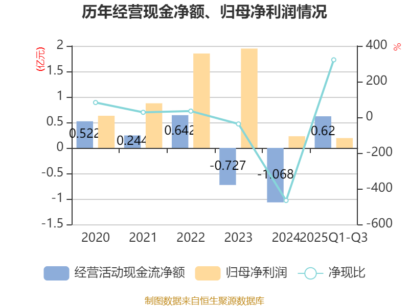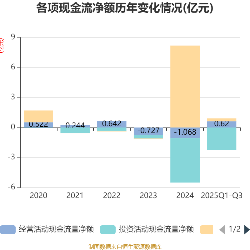 2025年前三季度,公司经营活动现金流净额为6197.6万元,同比增加1.83亿元;筹资活动现金流净额2909.33万元,同比减少7.9亿元;投资活动现金流净额-2.28亿元,上年同期为-6.18亿元。