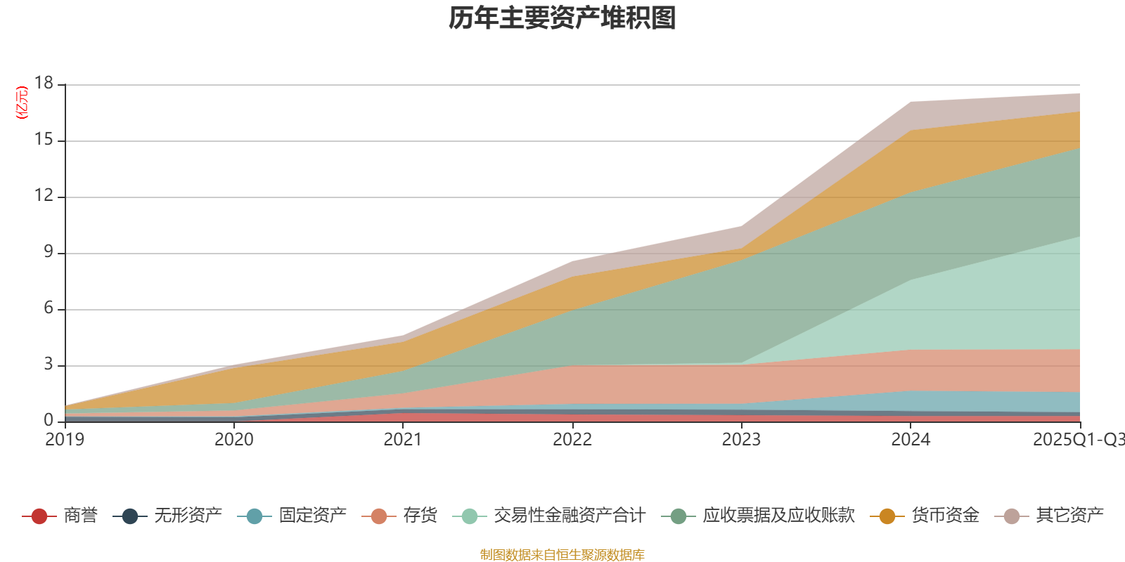 资产重大变化方面,截至2025年三季度末,公司交易性金融资产合计较上年末增加61.59%,占公司总资产比重上升12.54个百分点;货币资金较上年末减少41.31%,占公司总资产比重下降8.32个百分点;应收款项融资较上年末减少57.96%,占公司总资产比重下降2.82个百分点;预付款项较上年末减少51.99%,占公司总资产比重下降0.56个百分点。