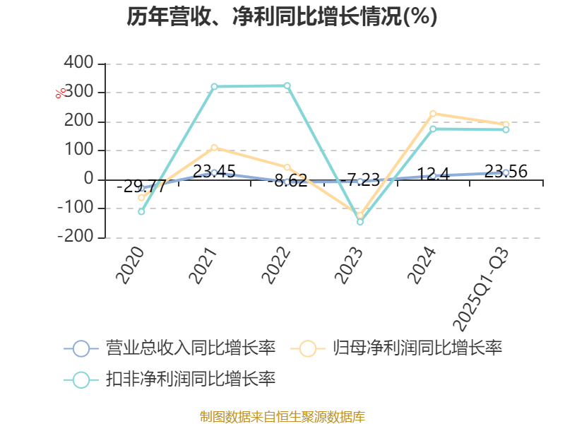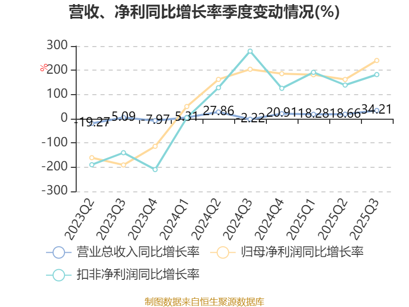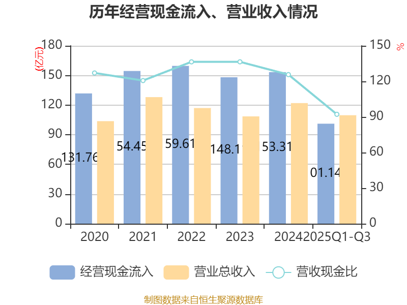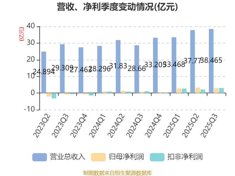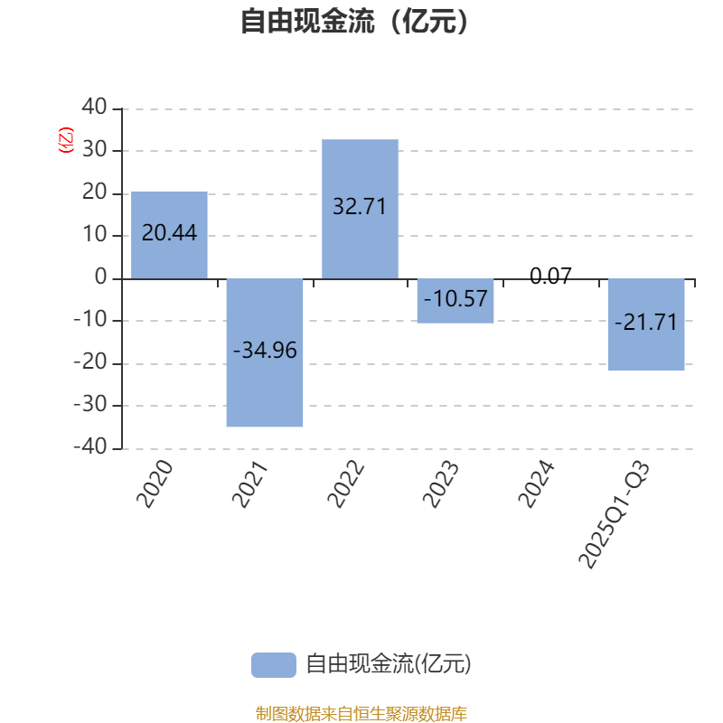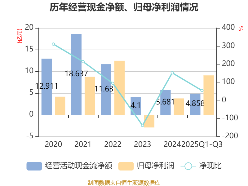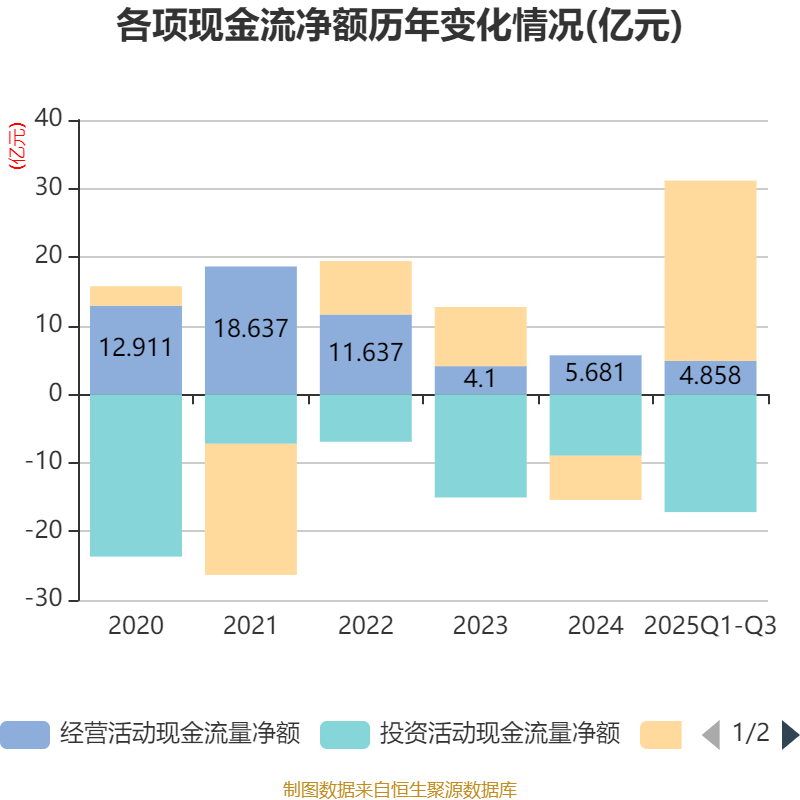 2025年前三季度,公司经营活动现金流净额为4.86亿元,同比增长36.08%;筹资活动现金流净额26.32亿元,同比增加39.45亿元;投资活动现金流净额-17.18亿元,上年同期为-8.86亿元。