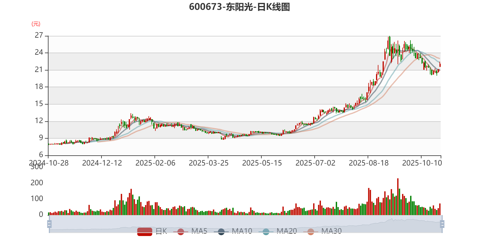中证智能财讯东阳光(600673)10月28日披露2025年第三季度报告。前三季度公司实现营业总收入109.7亿元,同比增长23.56%;归母净利润9.06亿元,同比增长189.80%;扣非净利润7.87亿元,同比增长171.77%;经营活动产生的现金流量净额为4.86亿元,同比增长36.08%;报告期内,东阳光基本每股收益为0.309元,加权平均净资产收益率为9.75%。