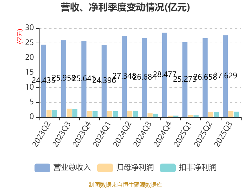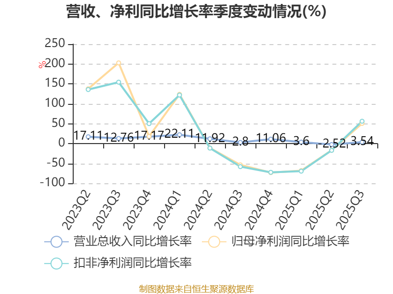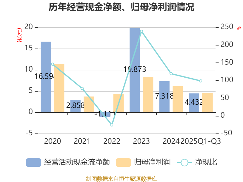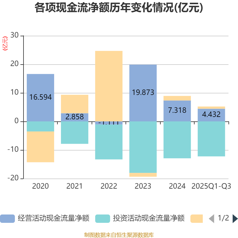 2025年前三季度,公司经营活动现金流净额为4.43亿元,同比增长1.73%;筹资活动现金流净额7736.84万元,同比减少4亿元;投资活动现金流净额-12.26亿元,上年同期为-7.3亿元。