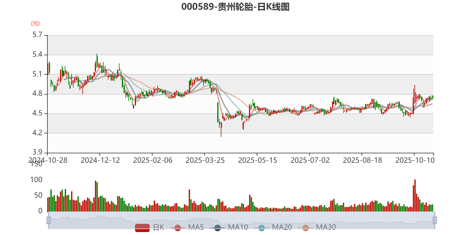 中证智能财讯贵州轮胎(000589)10月28日披露2025年第三季度报告。前三季度公司实现营业总收入79.56亿元,同比增长1.44%;归母净利润4.5亿元,同比下降19.72%;扣非净利润4.28亿元,同比下降20.72%;经营活动产生的现金流量净额为4.43亿元,同比增长1.73%;报告期内,贵州轮胎基本每股收益为0.29元,加权平均净资产收益率为5.03%。公司2025年前三季度分配预案为:拟向全体股东每10股派现0.4元(含税)。