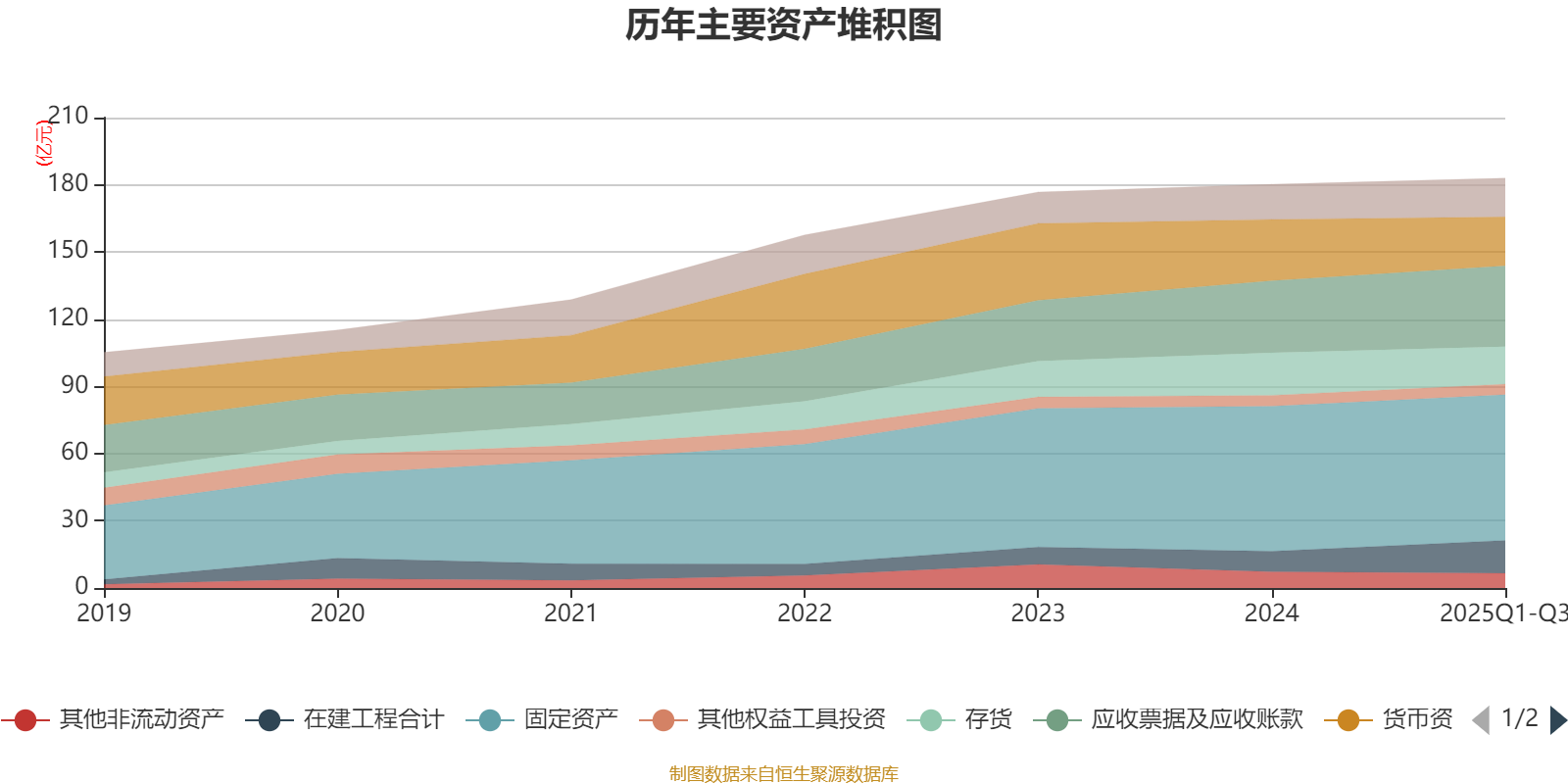 资产重大变化方面,截至2025年三季度末,公司货币资金较上年末减少20.15%,占公司总资产比重下降3.25个百分点;在建工程合计较上年末增加60.86%,占公司总资产比重上升2.96个百分点;应收票据及应收账款较上年末增加11.89%,占公司总资产比重上升1.82个百分点;存货较上年末减少11.45%,占公司总资产比重下降1.35个百分点。