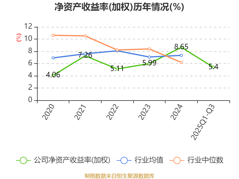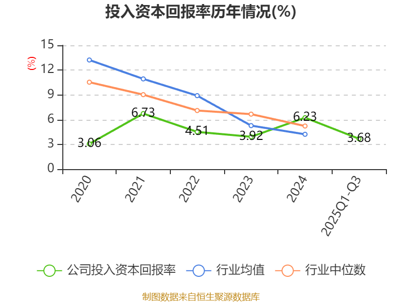 盈利能力方面, 2025年前三季度公司加权平均净资产收益率为5.4%,同比下降2.48个百分点。公司2025年前三季度投入资本回报率为3.68%,较上年同期下降2.58个百分点。
