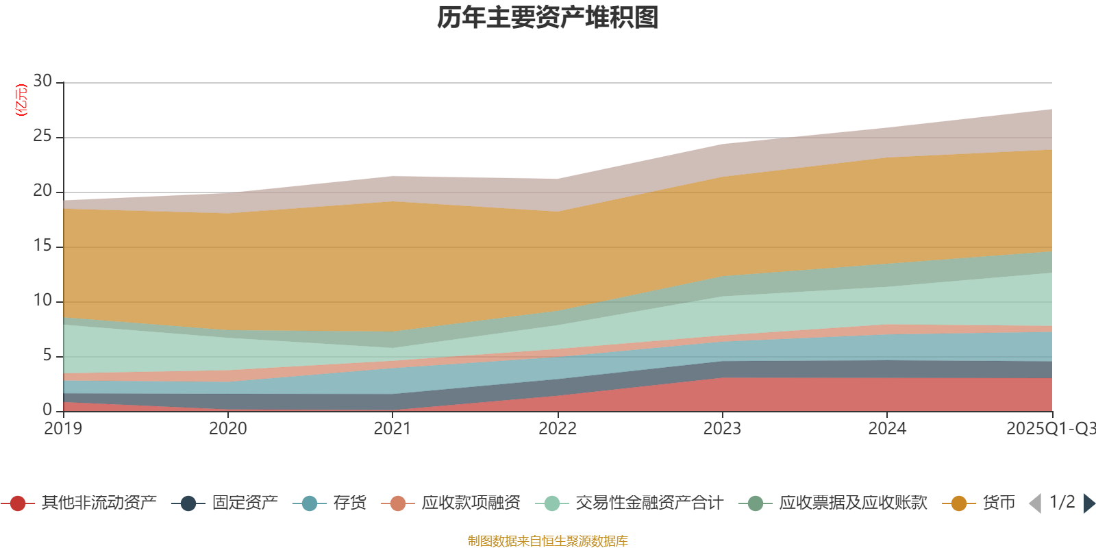 资产重大变化方面,截至2025年三季度末,公司交易性金融资产合计较上年末增加41.71%,占公司总资产比重上升4.37个百分点;在建工程合计较上年末增加526.99%,占公司总资产比重上升3.91个百分点;货币资金较上年末减少4.2%,占公司总资产比重下降3.77个百分点;应收款项融资较上年末减少41.18%,占公司总资产比重下降1.61个百分点。