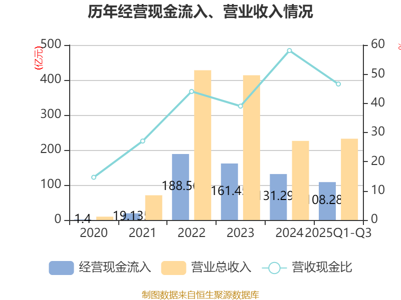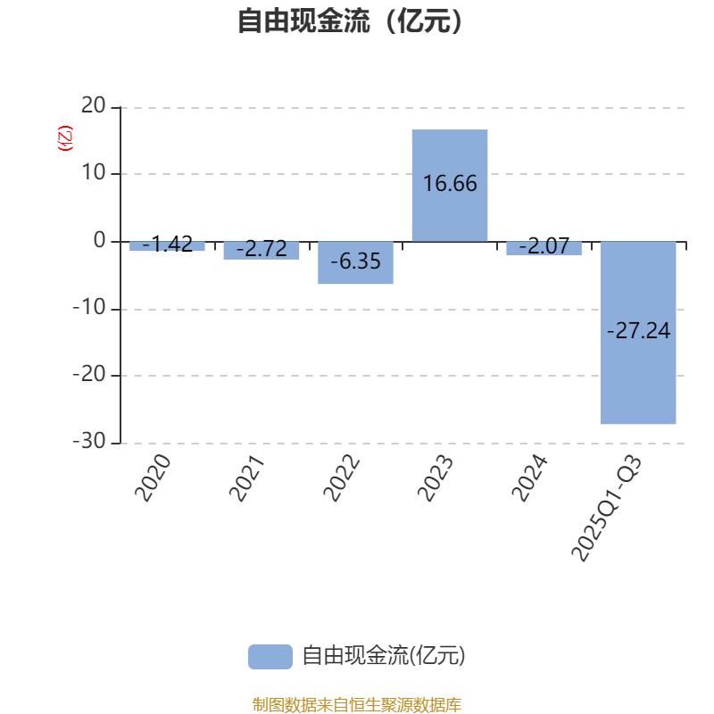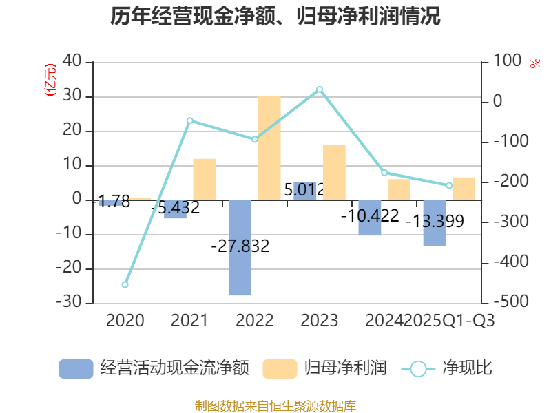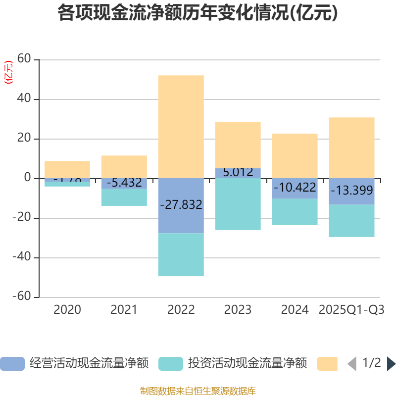 2025年前三季度,公司经营活动现金流净额为-13.4亿元,同比减少10.94亿元;筹资活动现金流净额30.69亿元,同比增加18.96亿元;投资活动现金流净额-16.33亿元,上年同期为-10.05亿元。