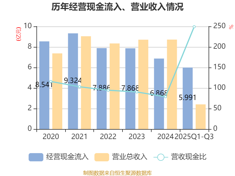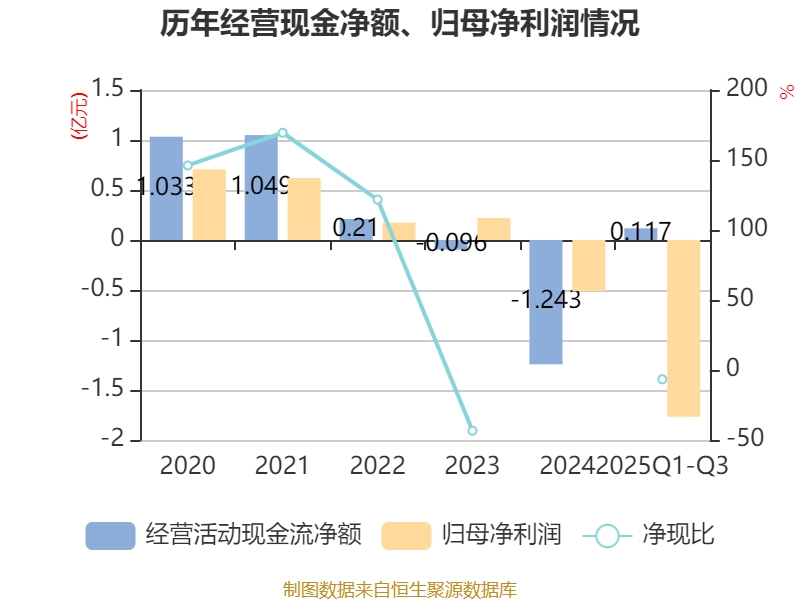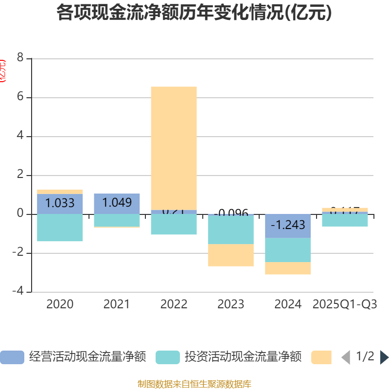 2025年前三季度,公司经营活动现金流净额为1170.54万元,同比增加8230.34万元;筹资活动现金流净额1916.32万元,同比增加782万元;投资活动现金流净额-6473.61万元,上年同期为-9233.39万元。
