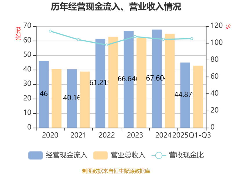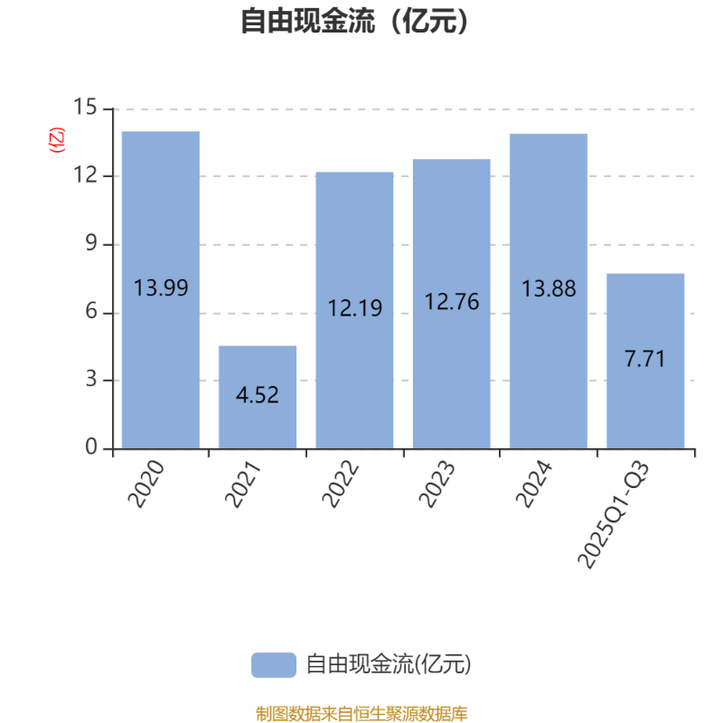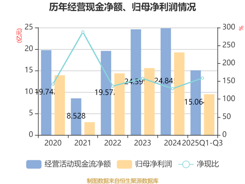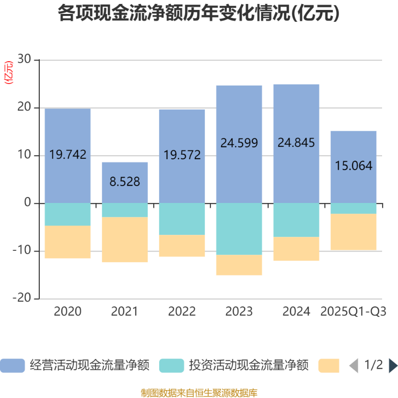 2025年前三季度,公司经营活动现金流净额为15.06亿元,同比下降27.69%;筹资活动现金流净额-7.6亿元,同比减少3.64亿元;投资活动现金流净额-2.27亿元,上年同期为-90.34万元。