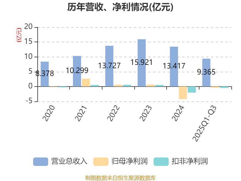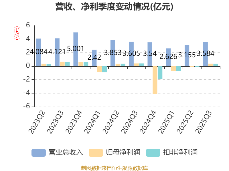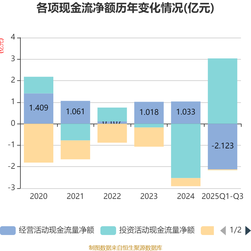 2025年前三季度,公司经营活动现金流净额为-2.12亿元,同比减少4043.14万元;筹资活动现金流净额-402.71万元,同比增加3174.5万元;投资活动现金流净额3.04亿元,上年同期为183.45万元。