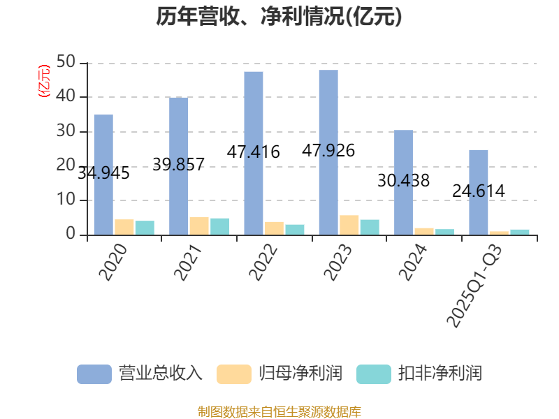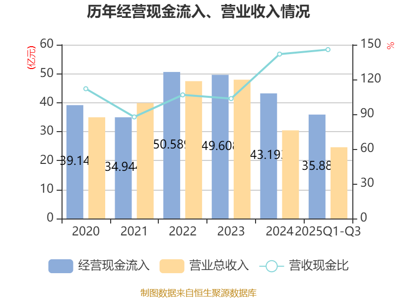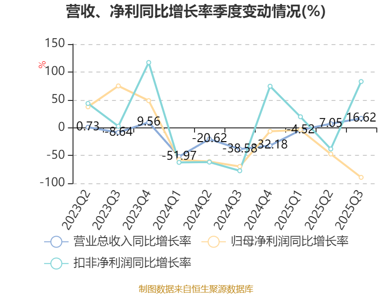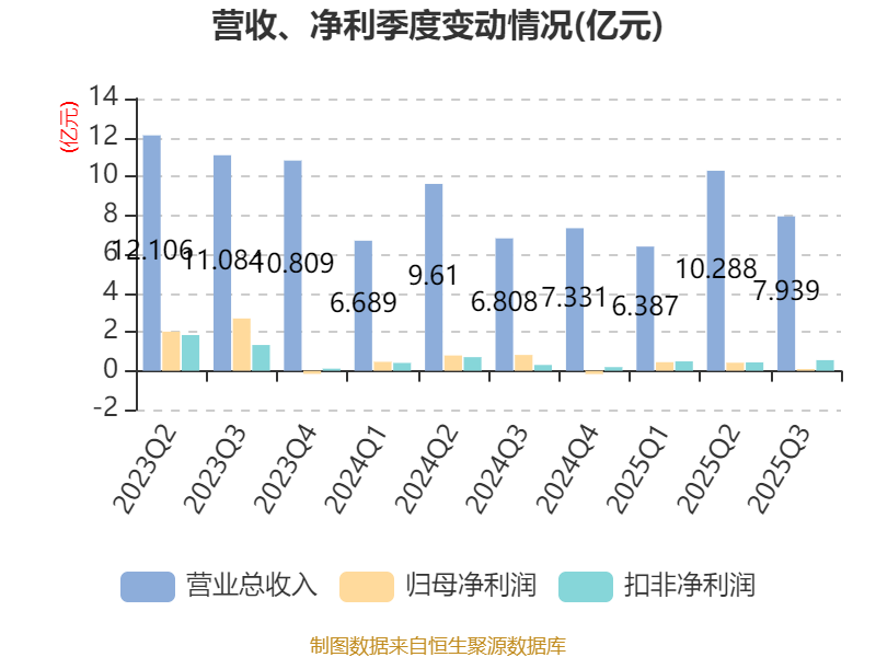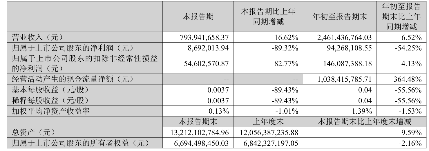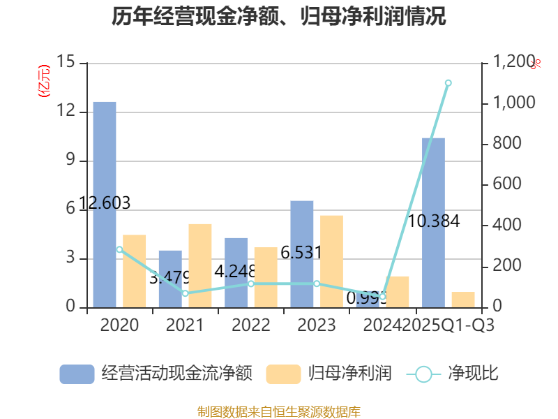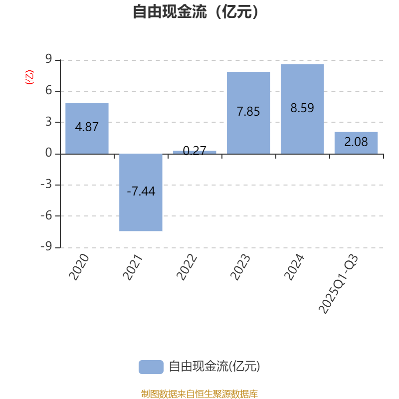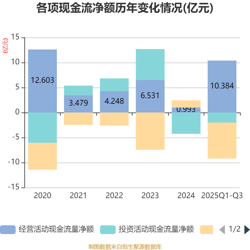 2025年前三季度,公司经营活动现金流净额为10.38亿元,同比增加14.31亿元;筹资活动现金流净额-7.21亿元,同比减少9.06亿元;投资活动现金流净额-2.01亿元,上年同期为-1.41亿元。