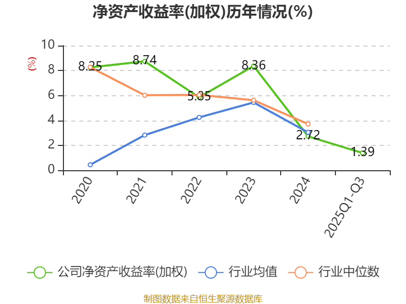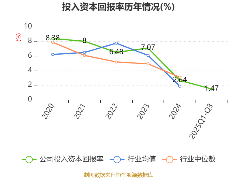 盈利能力方面, 2025年前三季度公司加权平均净资产收益率为1.39%,同比下降1.53个百分点。公司2025年前三季度投入资本回报率为1.47%,较上年同期下降1.44个百分点。