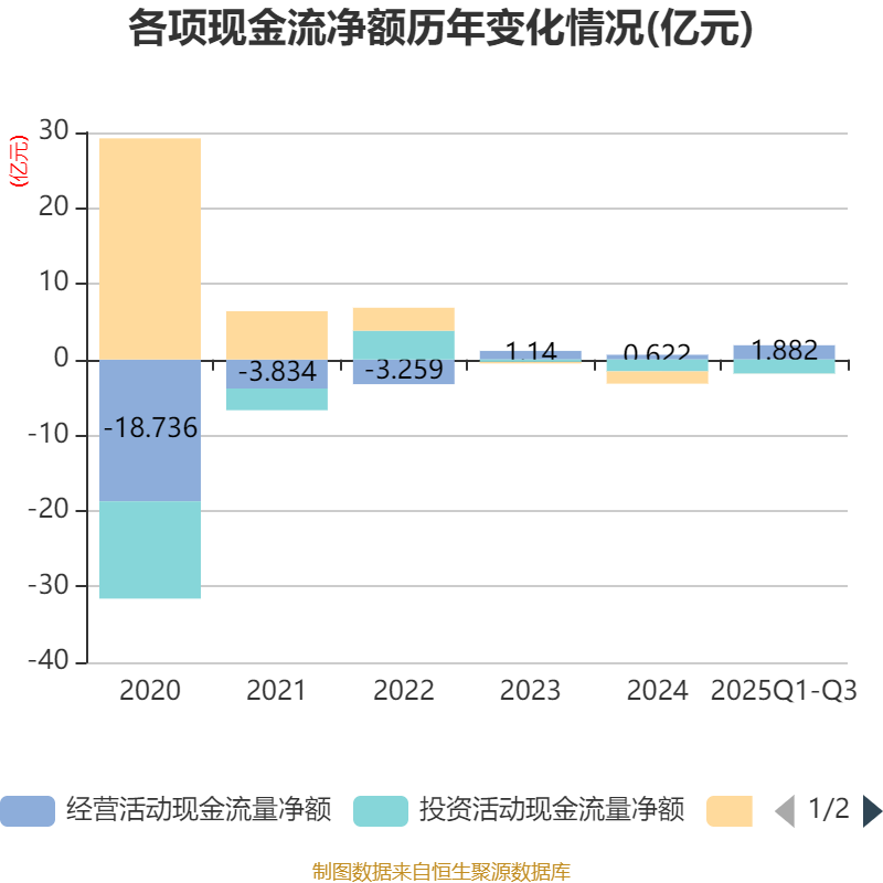 2025年前三季度,公司经营活动现金流净额为1.88亿元,同比增长258.79%;筹资活动现金流净额-159.77万元,同比增加1049.01万元;投资活动现金流净额-1.85亿元,上年同期为-1.35亿元。