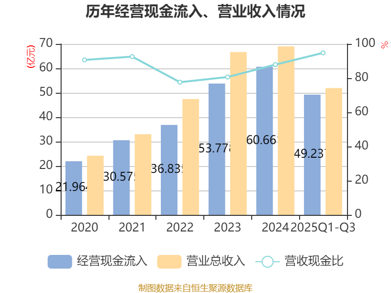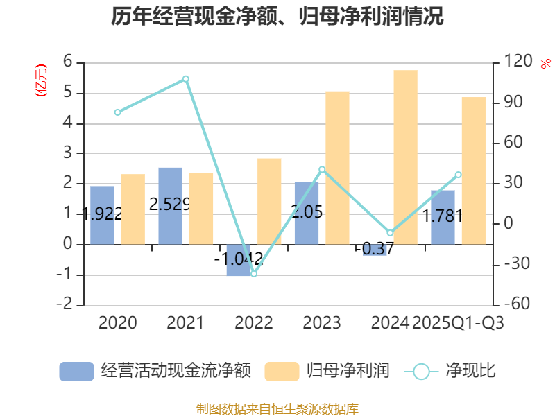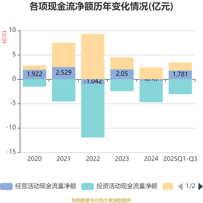 2025年前三季度,公司经营活动现金流净额为1.78亿元,同比增加2.65亿元;筹资活动现金流净额1.64亿元,同比减少2.56亿元;投资活动现金流净额-3.08亿元,上年同期为-3.76亿元。