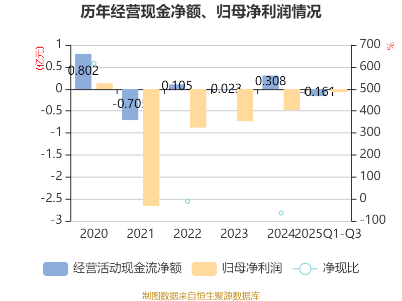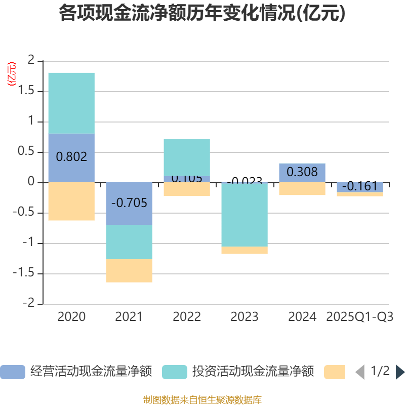 2025年前三季度,公司经营活动现金流净额为-1614.97万元,同比减少3561.77万元;筹资活动现金流净额-640.76万元,同比增加821.2万元;投资活动现金流净额-58.88万元,上年同期为-26.51万元。