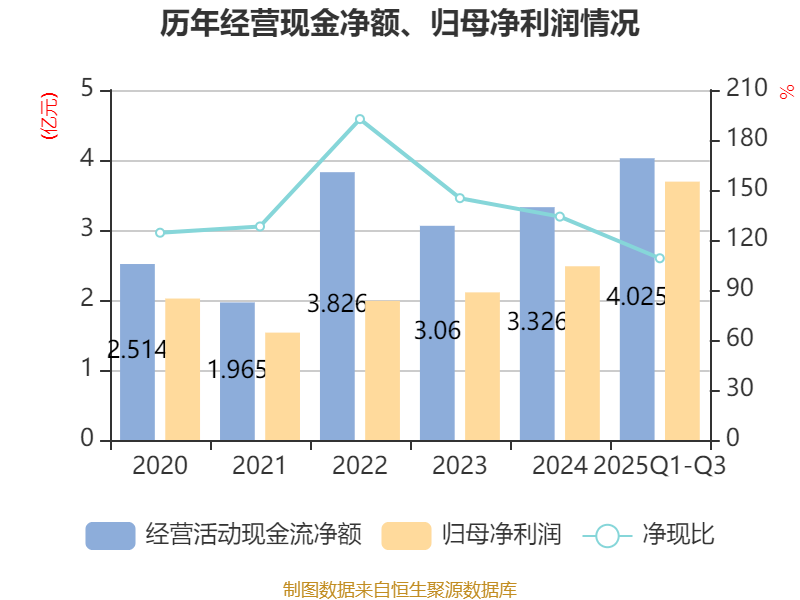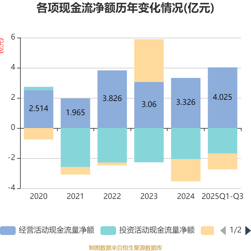 2025年前三季度,公司经营活动现金流净额为4.02亿元,同比增长41.18%;筹资活动现金流净额-1.05亿元,同比增加4174.4万元;投资活动现金流净额-1.69亿元,上年同期为-1.54亿元。
