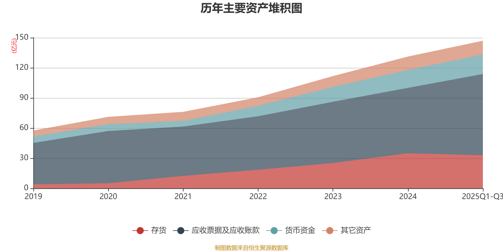 资产重大变化方面,截至2025年三季度末,公司应收票据及应收账款较上年末增加24.1%,占公司总资产比重上升5.37个百分点;存货较上年末减少5.51%,占公司总资产比重下降4.15个百分点;货币资金较上年末增加9.05%,占公司总资产比重下降0.36个百分点;应收款项融资较上年末减少51.75%,占公司总资产比重下降0.32个百分点。
