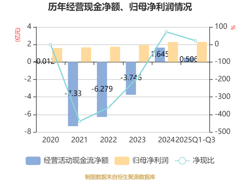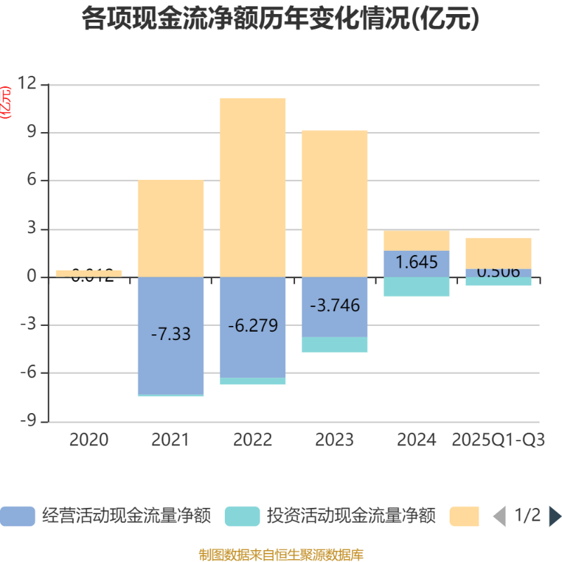 2025年前三季度,公司经营活动现金流净额为5057.67万元,同比增加11.43亿元;筹资活动现金流净额1.91亿元,同比减少3.68亿元;投资活动现金流净额-5327.84万元,上年同期为-5130.23万元。