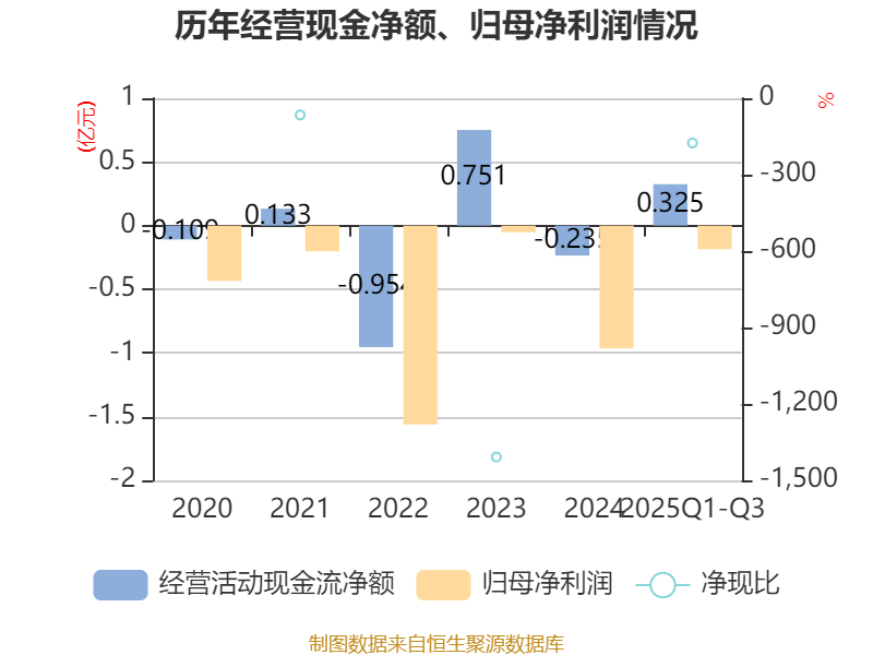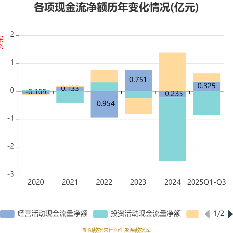 2025年前三季度,公司经营活动现金流净额为3246.03万元,同比增加4566.52万元;筹资活动现金流净额2997.92万元,同比增加4242.09万元;投资活动现金流净额-8670.43万元,上年同期为-1.95亿元。