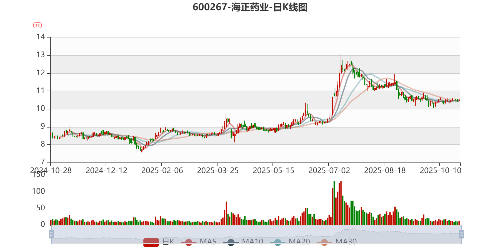 中证智能财讯海正药业(600267)10月28日披露2025年第三季度报告。前三季度公司实现营业总收入79.23亿元,同比增长0.61%;归母净利润4.61亿元,同比下降10.55%;扣非净利润4.91亿元,同比增长41.96%;经营活动产生的现金流量净额为16.45亿元,同比增长12.99%;报告期内,海正药业基本每股收益为0.4元,加权平均净资产收益率为5.47%。
