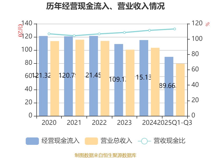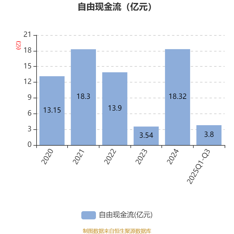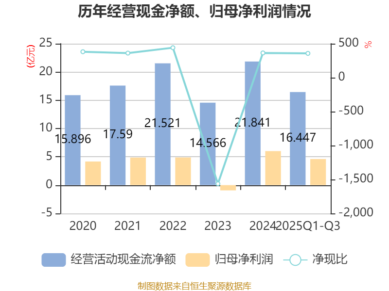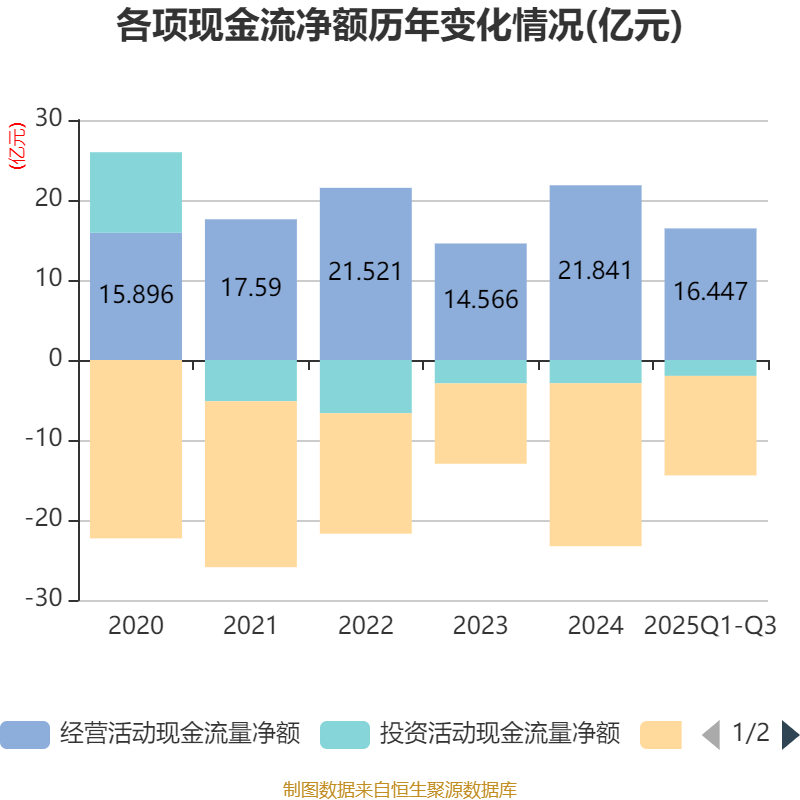 2025年前三季度,公司经营活动现金流净额为16.45亿元,同比增长12.99%;筹资活动现金流净额-12.44亿元,同比增加2.31亿元;投资活动现金流净额-1.99亿元,上年同期为-1.2亿元。