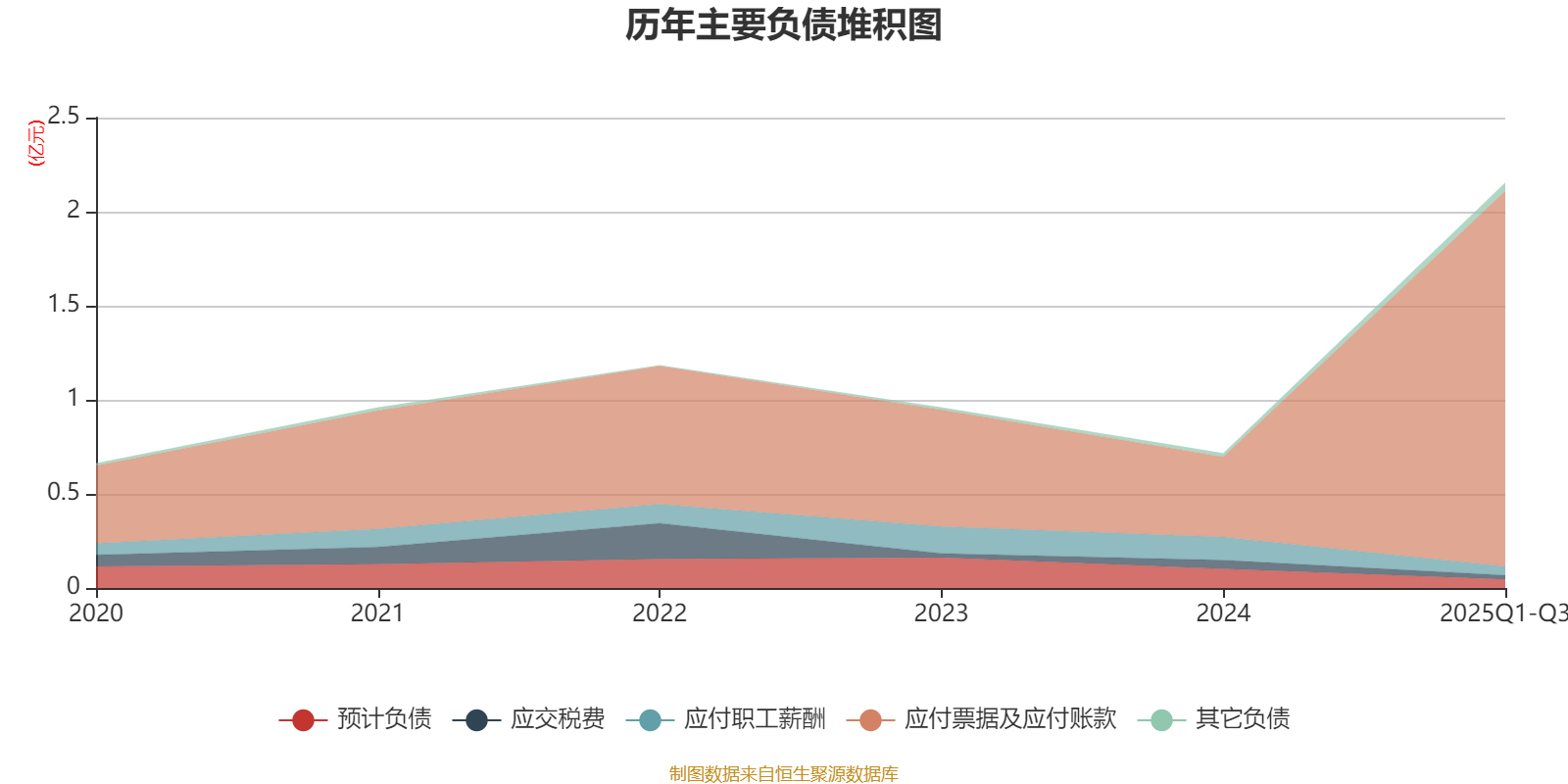 负债重大变化方面,截至2025年三季度末,公司应付票据及应付账款较上年末增加368.74%,占公司总资产比重上升8.3个百分点;应付职工薪酬较上年末减少62.07%,占公司总资产比重下降0.47个百分点;预计负债较上年末减少53.79%,占公司总资产比重下降0.34个百分点;应交税费较上年末减少53.8%,占公司总资产比重下降0.16个百分点。