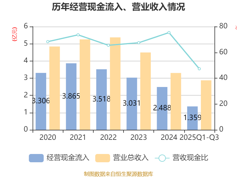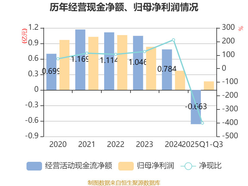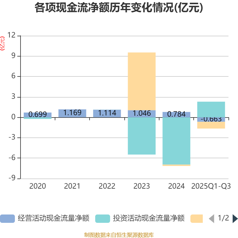 2025年前三季度,公司经营活动现金流净额为-6633.34万元,同比减少1.5亿元;筹资活动现金流净额-9918.5万元,同比减少7919.93万元;投资活动现金流净额2.3亿元,上年同期为-5.78亿元。