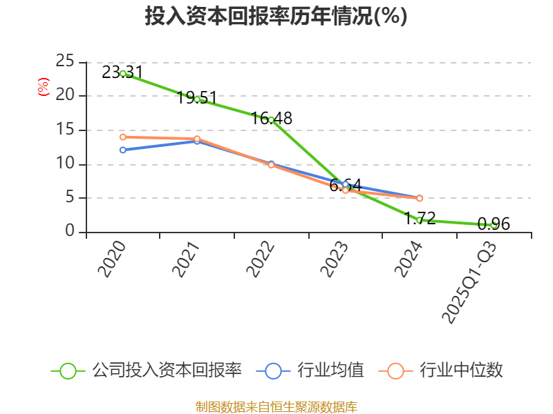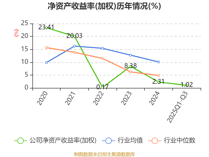 盈利能力方面, 2025年前三季度公司加权平均净资产收益率为1.02%,同比下降1.33个百分点。公司2025年前三季度投入资本回报率为0.96%,较上年同期下降0.88个百分点。