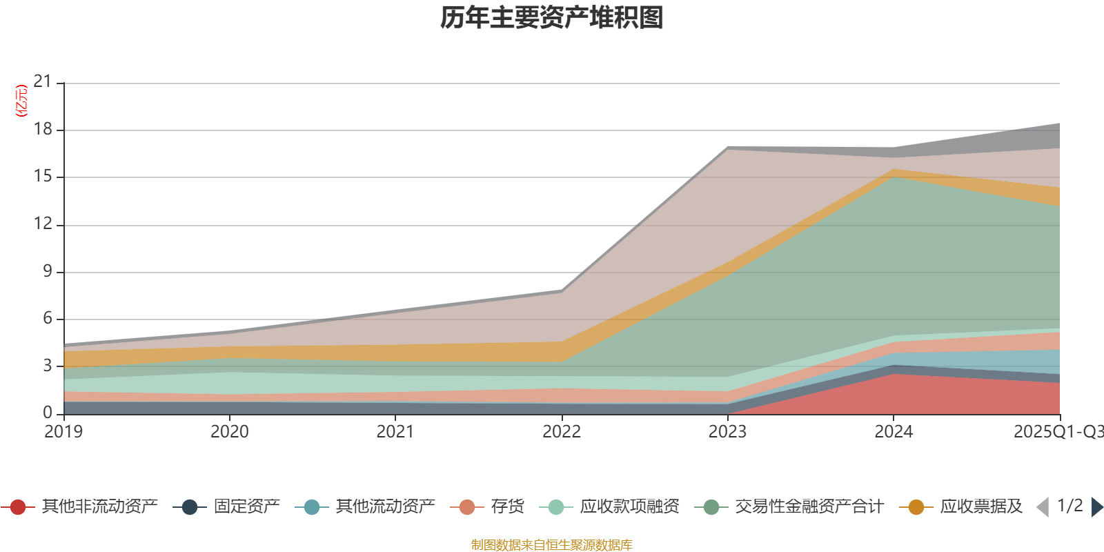 资产重大变化方面,截至2025年三季度末,公司交易性金融资产合计较上年末减少23.41%,占公司总资产比重下降17.73个百分点;货币资金较上年末增加254.88%,占公司总资产比重上升9.32个百分点;其他非流动资产较上年末减少22.27%,占公司总资产比重下降4.31个百分点;在建工程合计较上年末增加742.6%,占公司总资产比重上升4.04个百分点。