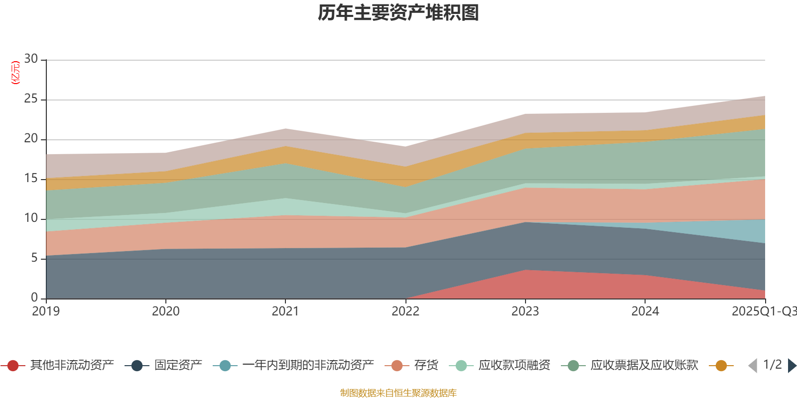 资产重大变化方面,截至2025年三季度末,公司一年内到期的非流动资产较上年末增加301.53%,占公司总资产比重上升8.6个百分点;其他非流动资产较上年末减少65.64%,占公司总资产比重下降8.57个百分点;存货较上年末增加19.58%,占公司总资产比重上升1.79个百分点;固定资产较上年末增加1.68%,占公司总资产比重下降1.63个百分点。