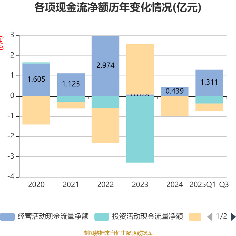 2025年前三季度,公司经营活动现金流净额为1.31亿元,同比增加1.59亿元;筹资活动现金流净额-3826.63万元,同比增加738.63万元;投资活动现金流净额-3669.51万元,上年同期为1045.22万元。