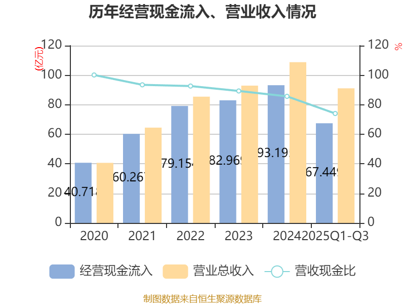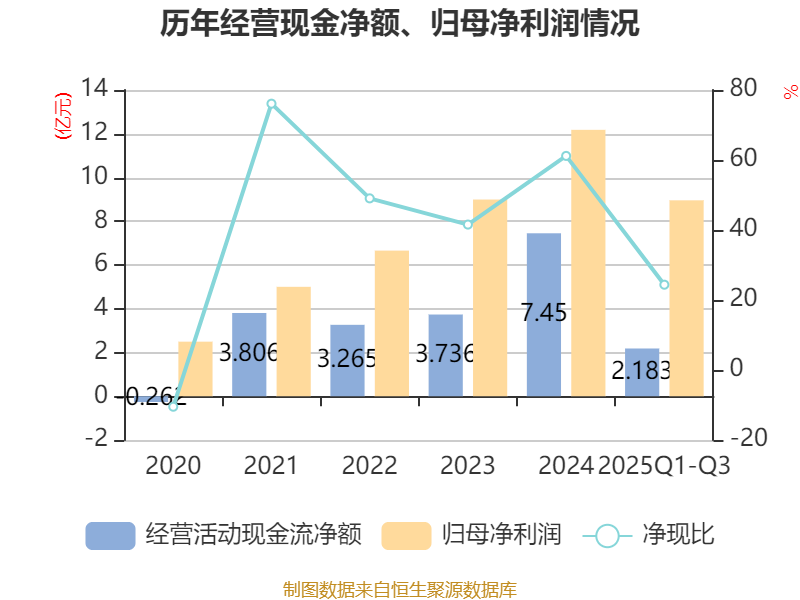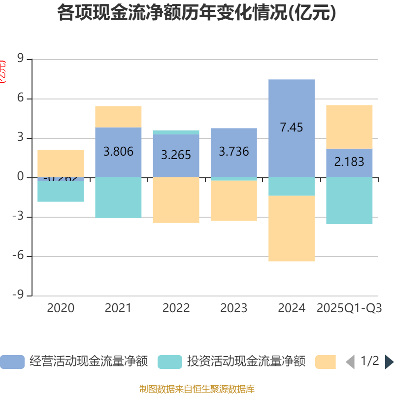 2025年前三季度,公司经营活动现金流净额为2.18亿元,同比下降67.52%;筹资活动现金流净额3.31亿元,同比增加8.62亿元;投资活动现金流净额-3.56亿元,上年同期为-1741.85万元。