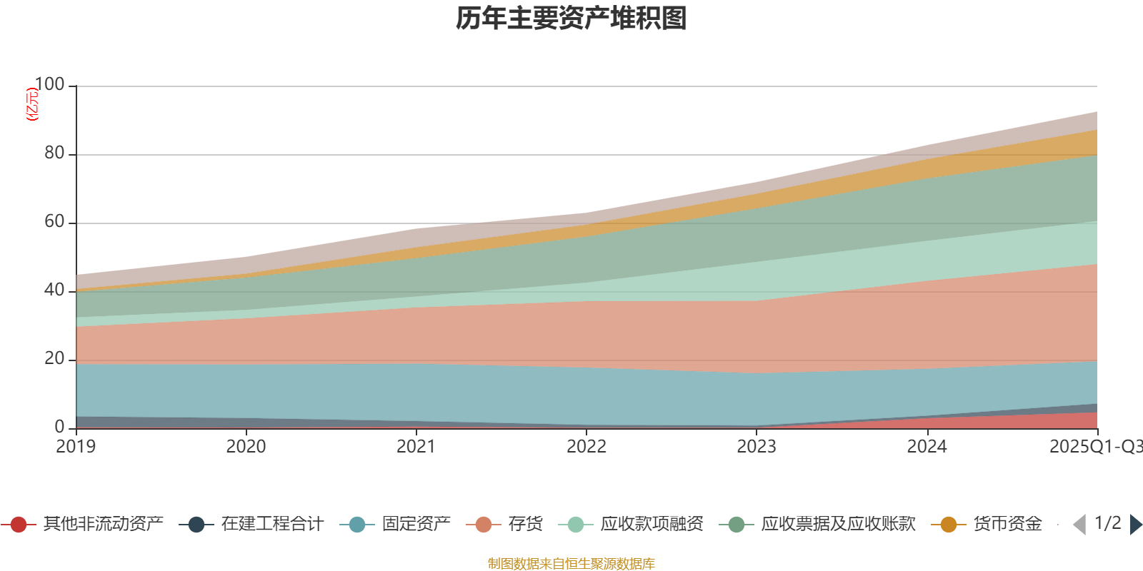 资产重大变化方面,截至2025年三季度末,公司固定资产较上年末减少9.72%,占公司总资产比重下降3.2个百分点;在建工程合计较上年末增加250.04%,占公司总资产比重上升1.88个百分点;其他非流动资产较上年末增加59.41%,占公司总资产比重上升1.49个百分点;应收票据及应收账款较上年末增加5.2%,占公司总资产比重下降1.32个百分点。